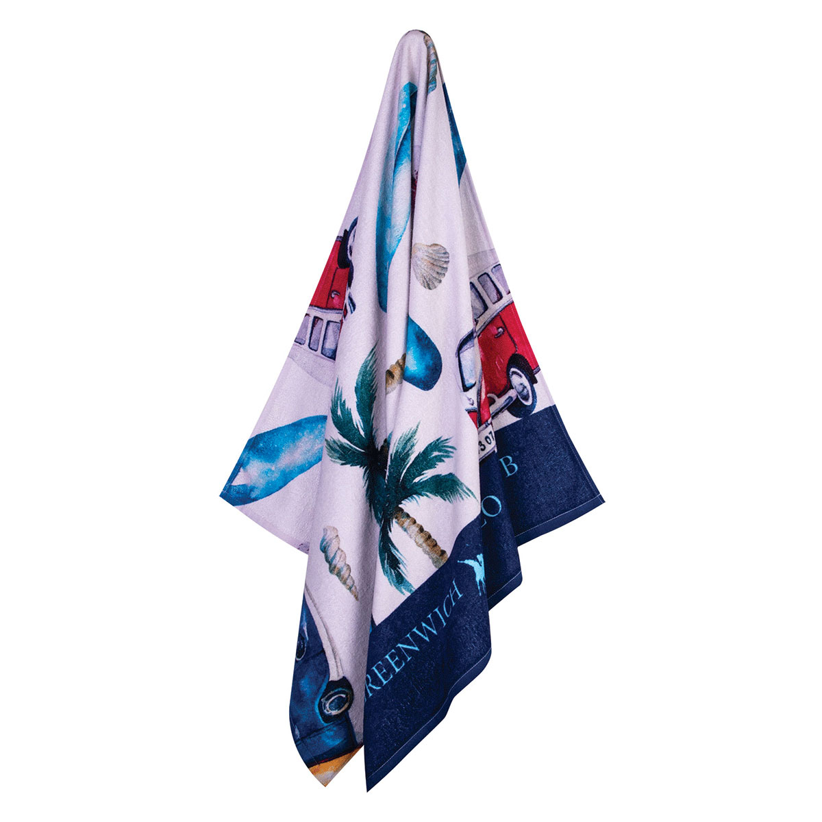 Παιδική πετσέτα θαλάσσης από τον οίκο Greenwich Polo Club που προσφέρει ποιότητα, στυλ και πολυτέλεια. Έχει μπλε χρώμα, πολύχρωμες λεπτομέρειες με το λογότυπο της εταιρίας και μοντέρνο σχέδιο. Είναι κατασκευασμένη από 100% υποαλλεργικό βαμβάκι σε ύφανση jacquard και βάρος 380 gsm. Στιλάτη και ποιοτική πετσέτα για το μπάνιο του παιδιού σας στην παραλία.