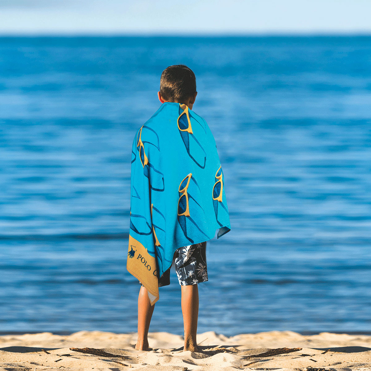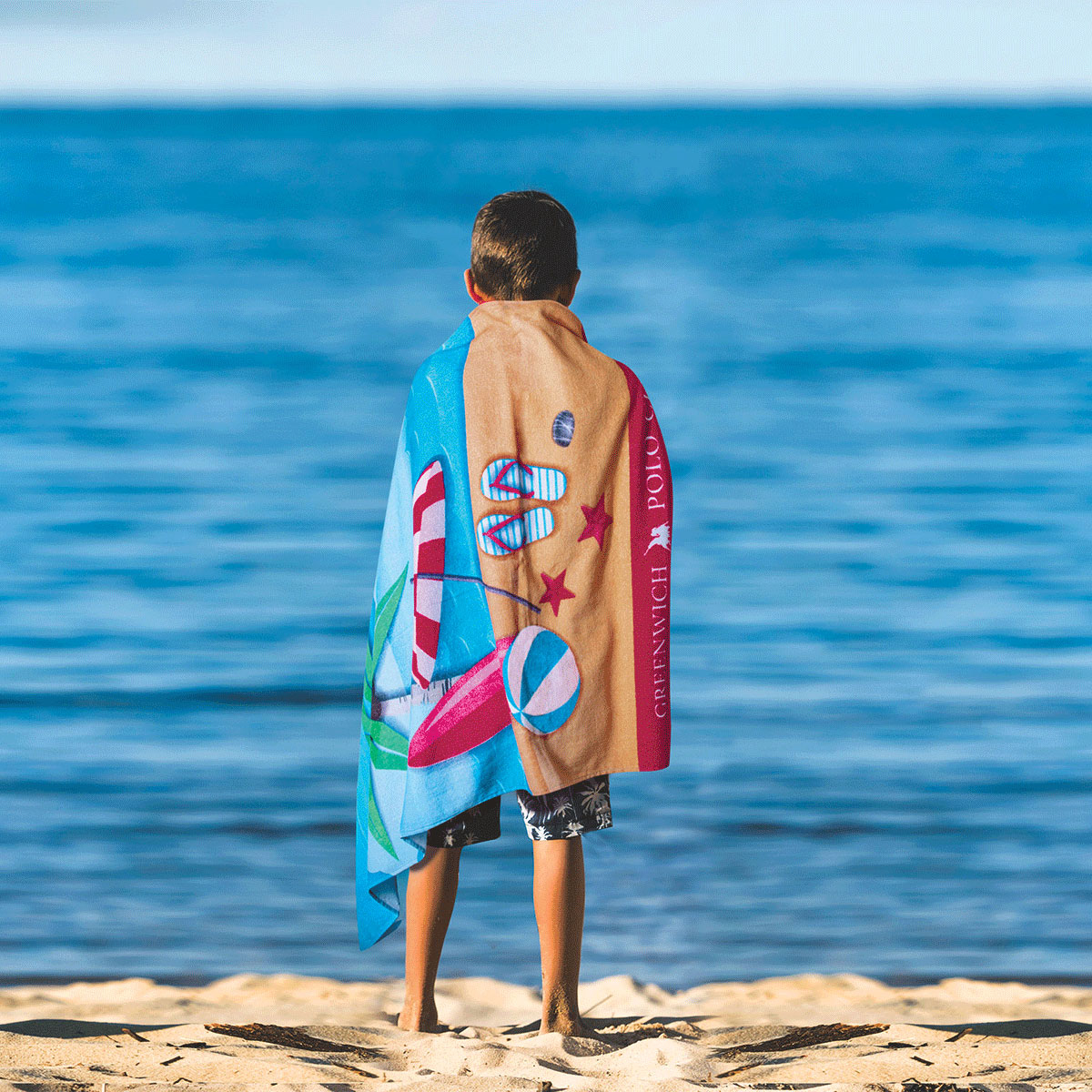 Παιδική πετσέτα θαλάσσης από τον οίκο Greenwich Polo Club που προσφέρει ποιότητα, στυλ και πολυτέλεια. Έχει τυρκουάζ-κίτρινες αποχρώσεις, το λογότυπο της εταιρίας και μοντέρνο σχέδιο. Είναι κατασκευασμένη από 100% υποαλλεργικό βαμβάκι σε ύφανση jacquard και βάρος 380 gsm. Στιλάτη και ποιοτική πετσέτα για το μπάνιο του παιδιού σας στην παραλία.