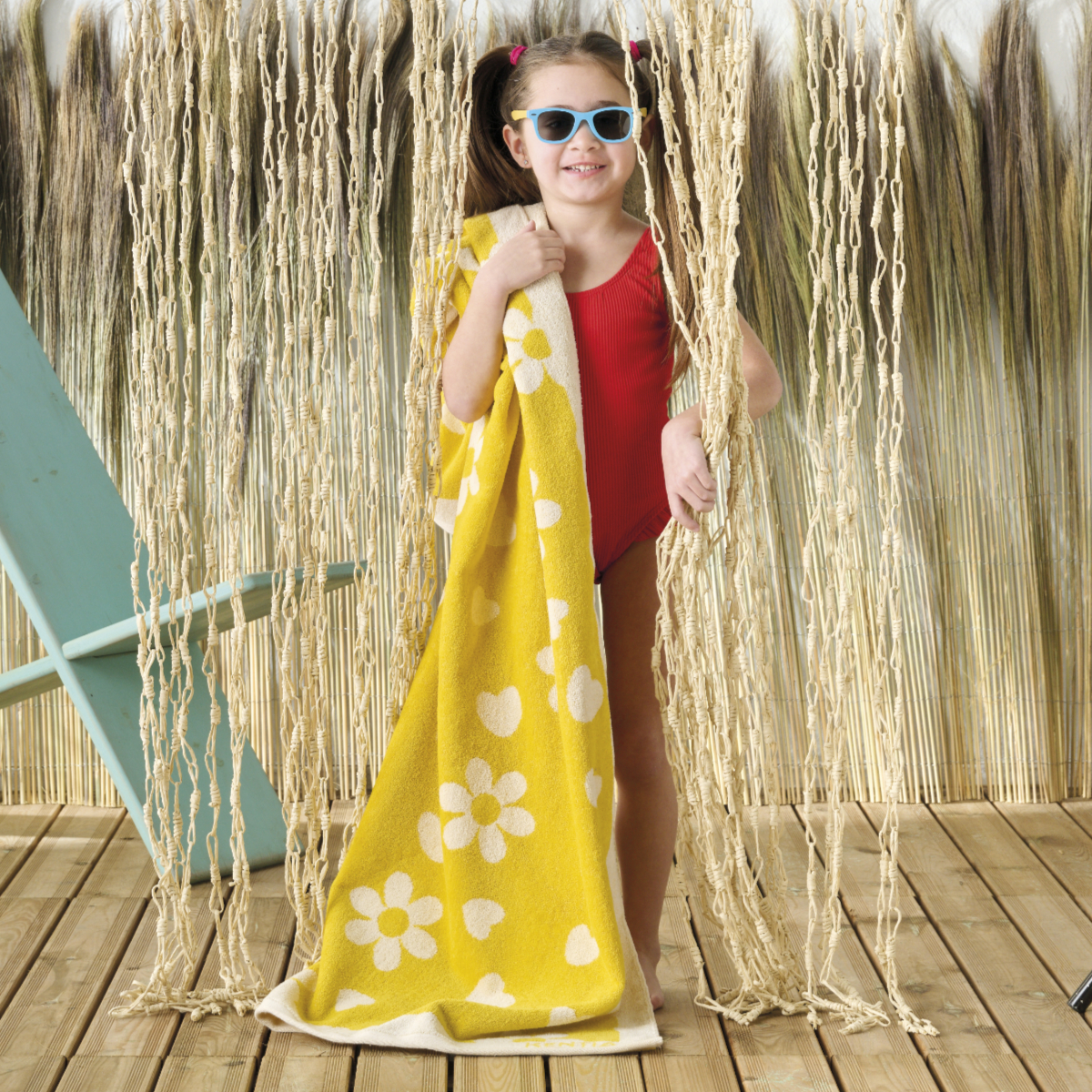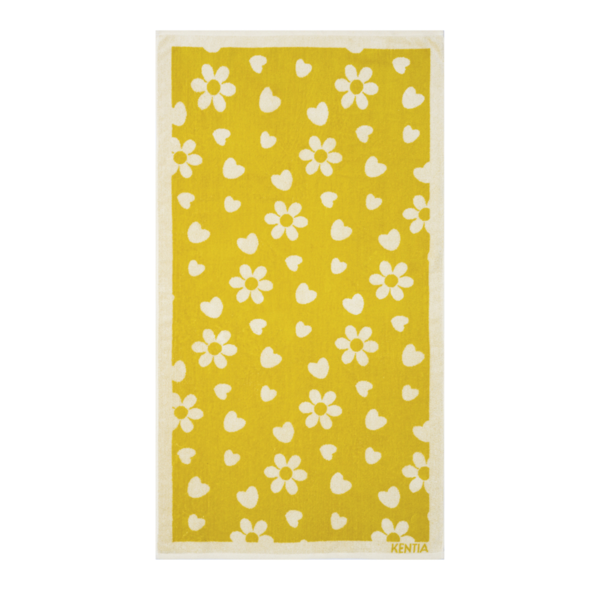 Παιδική πετσέτα θαλάσσης από την εταιρεία Kentia σε κίτρινο χρώμα με λευκές λεπτομέρειες και φλοράλ σχέδιο. Έχει βελουτέ ζακάρ ύφανση από 100% βαμβάκι βάρους 420gsm. Η μία πλευρά της είναι βελουτέ για απαλότητα και η άλλη είναι πετσετέ για απορροφητικότητα. Ιδανική για τις καλοκαιρινές εξορμήσεις στην παραλία.