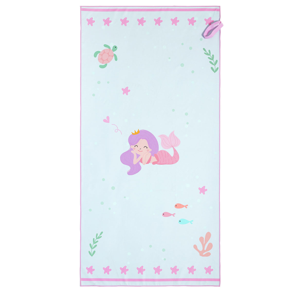 Παιδική πετσέτα μικροϊνών από την εταιρεία Nima. Είναι διπλής όψης με την μια μεριά σε τυρκουάζ χρώμα με ροζ λεπτομέρειες και σχέδιο γοργόνα, ενώ η άλλη πλευρά είναι σε ροζ χρώμα και πουά σχέδιο. Είναι κατασκευασμένη από 100% microfiber που την καθιστά που την καθιστά ελαφριά και υπέρ-απορροφητική και στεγνώνει γρήγορα. Δεν κολλάει η άμμος πάνω της, είναι ελαφριά και έχει έναν μικρό γάντζο για να την κρεμάτε παντού. Ιδανική καλοκαιρινή επιλογή για να χαρίσει χαρά και όρεξη για περισσότερο παιχνίδι στους μικρούς μας φίλους.