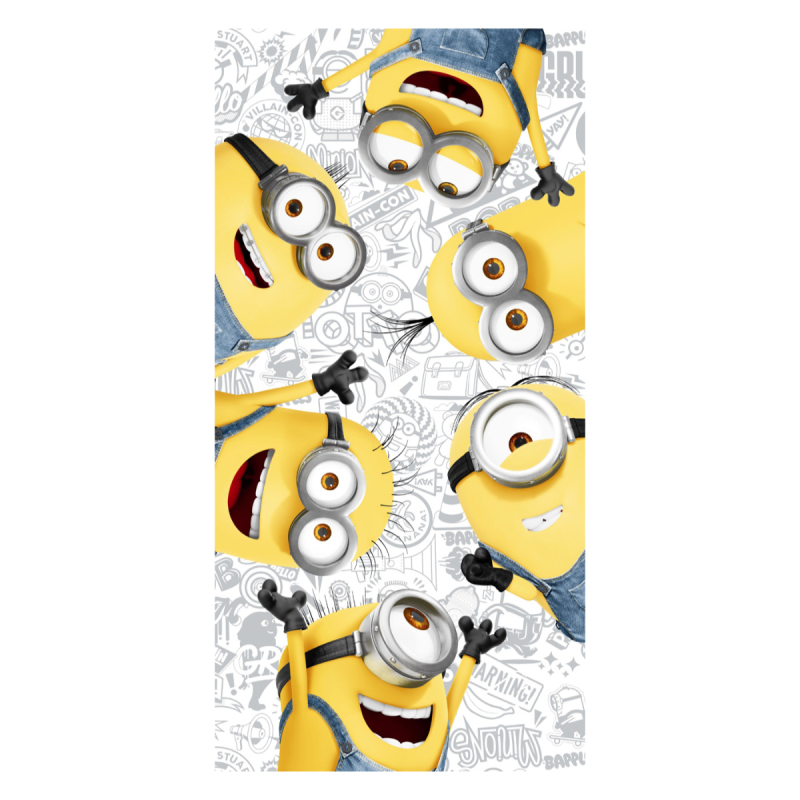 Παιδική πετσέτα θαλάσσης σε κίτρινο χρώμα με γκρι-μπλε λεπτομέρειες και σχέδιο με τα Minions της εταιρείας Viopros. Η σύνθεσή της από 100% βαμβάκι βάρους 320gsm προσφέρει απαλότητα και απορροφητικότητα. Έχει βελουτέ υφή και είναι ιδανική για την παραλία ή την πισίνα.