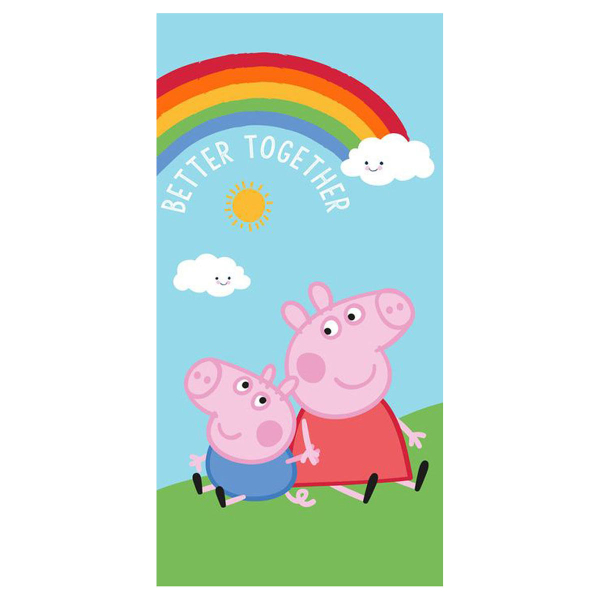 Παιδική πετσέτα θαλάσσης σε γαλάζιες-πολύχρωμες αποχρώσεις και σχέδιο από το cartoon Peppa Pig της εταιρείας Viopros. Η σύνθεσή της από 100% βαμβάκι βάρους 320gsm προσφέρει απαλότητα και απορροφητικότητα. Έχει βελουτέ υφή και είναι ιδανική για την παραλία ή την πισίνα.