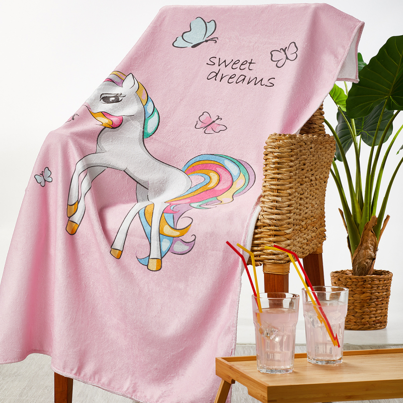 Παιδική πετσέτα θαλάσσης ροζ χρώμα, με γαλάζιες-μωβ λεπτομέρειες και τυπωτό σχέδιο μονόκερου από την εταιρεία Whitegg. Είναι κατασκευασμένη από 80% βαμβάκι και 20% microfiber. Η μία πλευρά της είναι πετσετέ που την καθιστά ανθεκτική ενώ η άλλη πλευρά είναι βελουτέ που προσφέρει απαλότητα. Είναι ιδιαίτερα πρακτική λύση για την παραλία, καθώς στεγνώνει γρήγορα και μεταφέρεται εύκολα μέσα στην τσάντα.
