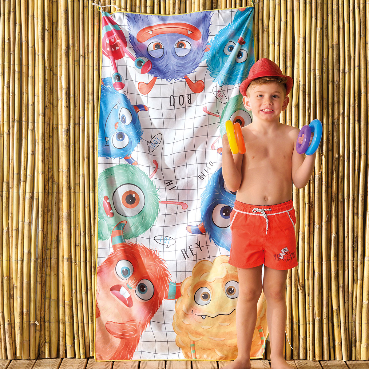 Παιδική πετσέτα μικροϊνών από την εταιρεία Kentia σε πολύχρωμες αποχρώσεις με μοντέρνο σχέδιο. Η πίσω όψη είναι γαλάζια με λευκές-μαύρες-κόκκινες λεπτομέρειες και μοντέρνο σχέδιο. Είναι κατασκευασμένη από microfiber σύνθεσης 80% polyester και 20% πολυαμίδιο με βάρος 190gsm. Είναι απαλή, ελαφριά, υπέρ-απορροφητική και στεγνώνει γρήγορα. Ιδανική επιλογή ως πετσέτα θαλάσσης, πετσέτα γυμναστηρίου, και γενικά ως πετσέτα για κάθε αθλητική δραστηριότητα.