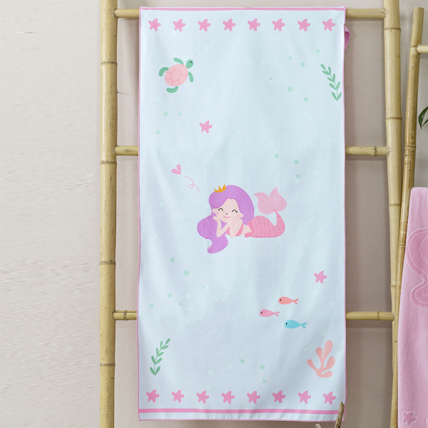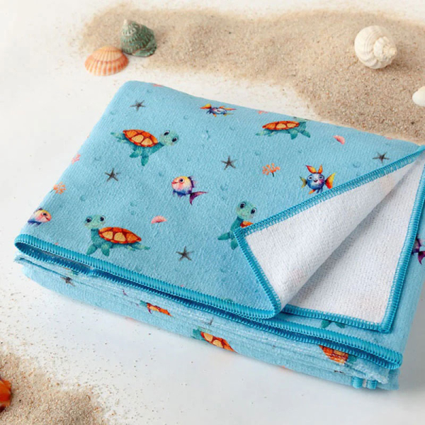 Παιδική πετσέτα μικροϊνών από την εταιρεία Nima. Είναι διπλής όψης με την μια μεριά σε γκρι χρώμα με πράσινες-μπλε λεπτομέρειες και σχέδιο ζωάκι, ενώ η άλλη πλευρά είναι σε μπλε-πράσινο χρώμα και μοντέρνο σχέδιο. Είναι κατασκευασμένη από 100% microfiber που την καθιστά που την καθιστά ελαφριά και υπέρ-απορροφητική και στεγνώνει γρήγορα. Δεν κολλάει η άμμος πάνω της, είναι ελαφριά και έχει έναν μικρό γάντζο για να την κρεμάτε παντού. Ιδανική καλοκαιρινή επιλογή για να χαρίσει χαρά και όρεξη για περισσότερο παιχνίδι στους μικρούς μας φίλους.