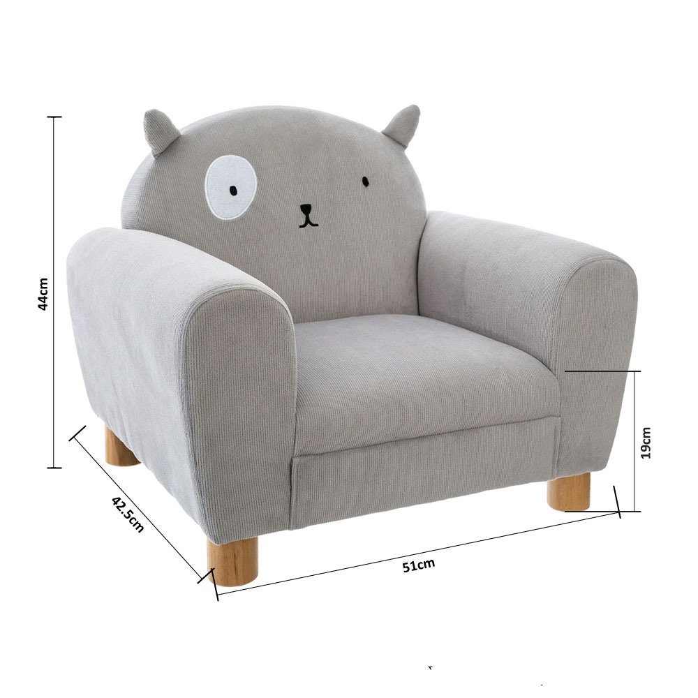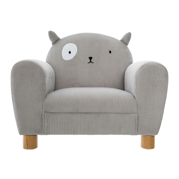 Παιδική πολυθρόνα που θα ταιριάξει μοναδικά στο παιδικό δωμάτιο. Ο σκελετός είναι κατασκευασμένος από ξύλο πεύκου σε φυσική απόχρωση με επένδυση αφρού πολυουρεθάνης (PU). Η ταπετσαρία είναι κοτλέ πολυεστερικό γκρι ύφασμα με σχέδιο γάτας. Κατάλληλη για χρήση σε εσωτερικό χώρο. Αντοχή βάρους έως και 30 κιλά. Προϊόν σύμφωνο με τα πρότυπα: NF D 60-300-1 και NF D 60-300-2.