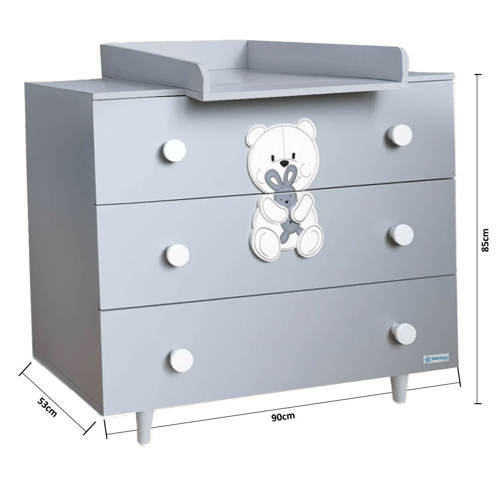 Αλλαξιέρα - συρταριέρα παιδική της εταιρείας Bebe Stars σε γκρι χρώμα τρισδιάστατο σχέδιο αρκουδάκι. Διαθέτει 3 ευρύχωρα συρτάρια με μηχανισμούς ασφαλείας που παρέχουν επαρκή αποθηκευτικό χώρο για όλα τα πράγματα του μωρού σας. Η αποσπώμενη αλλαξιέρα εξασφαλίζει την άνετη αλλαγή του μωρού. Τα πλαϊνά και η πλάτη της αλλαξιέρας είναι υπερυψωμένα προσφέροντας ασφάλεια κατά την αλλαγή της πάνας. Κατασκευασμένη από ξύλο πεύκου, σύμφωνα με το Ευρωπαϊκό Πρότυπο Ασφαλείας EN 12221-1,2:2008 + A1:2013 και βαμμένο με μη τοξικά χρώματα. Το προϊόν χρειάζεται συναρμολόγηση.