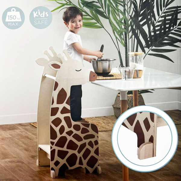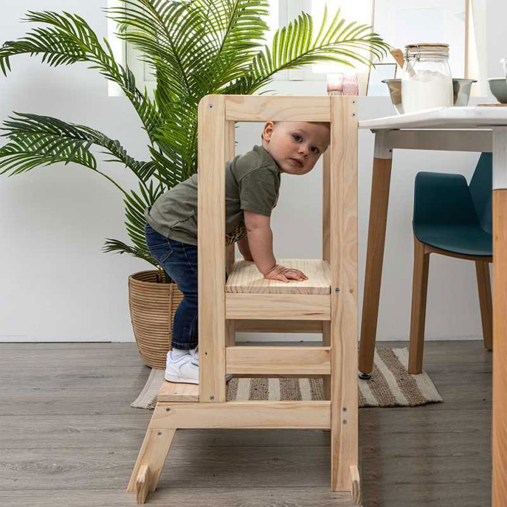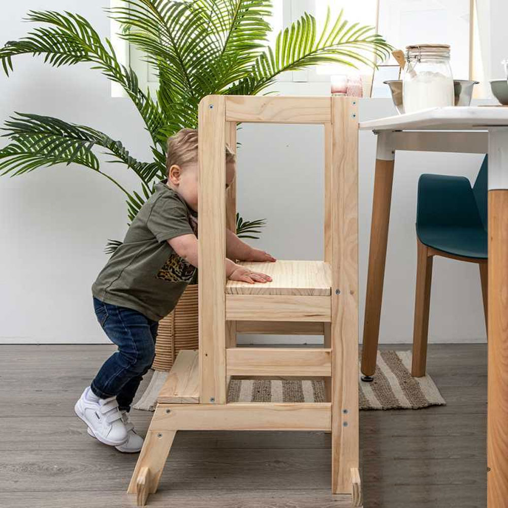 Πύργος εκμάθησης εμπνευσμένος από τη μέθοδο Montessori, για να εντάξετε το παιδί σας στις καθημερινές εργασίες του σπιτιού. Το παιδί ανεβαίνει στα σκαλοπάτια μόνο του υποβοηθούμενο από τα σταθερά προστατευτικά κιγκλιδώματα κι έτσι προστατεύεται από πτώσεις. Από εκεί το παιδί μπορεί να βοηθήσει στην προετοιμασία γευμάτων, στο στρώσιμο τραπεζιού, να πλύνει τα χέρια του ή τα δόντια του, και γενικά να λειτουργήσει ανεξάρτητο. Είναι κατασκευασμένο από ξύλο πεύκου σε φυσική απόχρωση. Ύψος πρώτου σκαλοπατιού από το έδαφος: 22.5cm και ύψος δεύτερου σκαλοπατιού από το έδαφος: 47cm. Διάσταση επιπεδου που στέκεται το παιδί: 38x26.5cm. Κατάλληλο για χρήση σε εσωτερικό χώρο. Αντοχή βάρους έως και 150 κιλά. Το προϊόν έρχεται αμοντάριστο και συναρμολογείται βάσει οδηγιών.