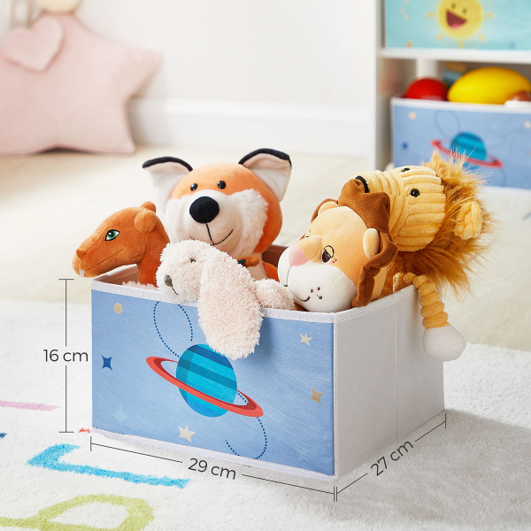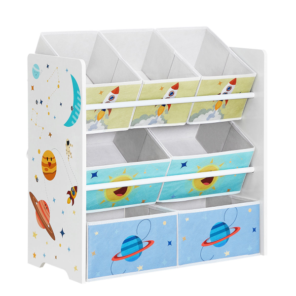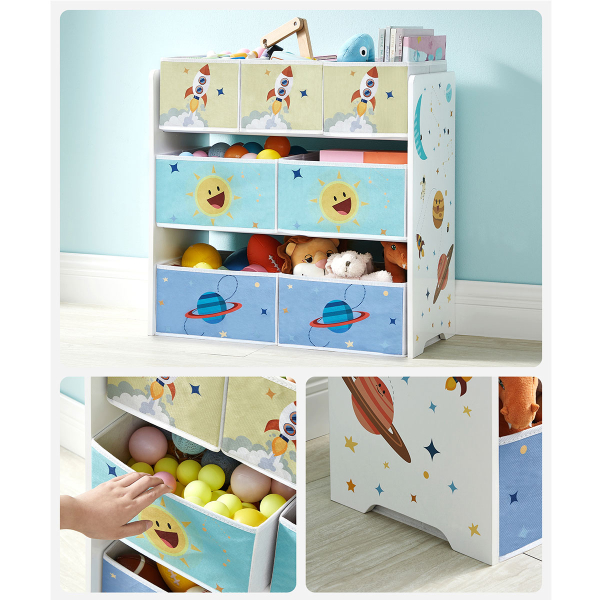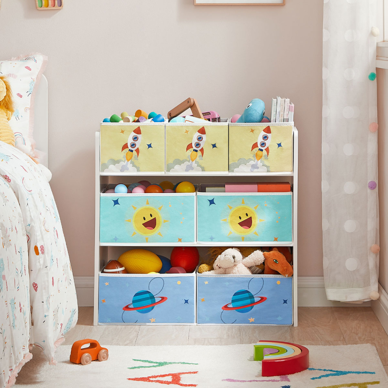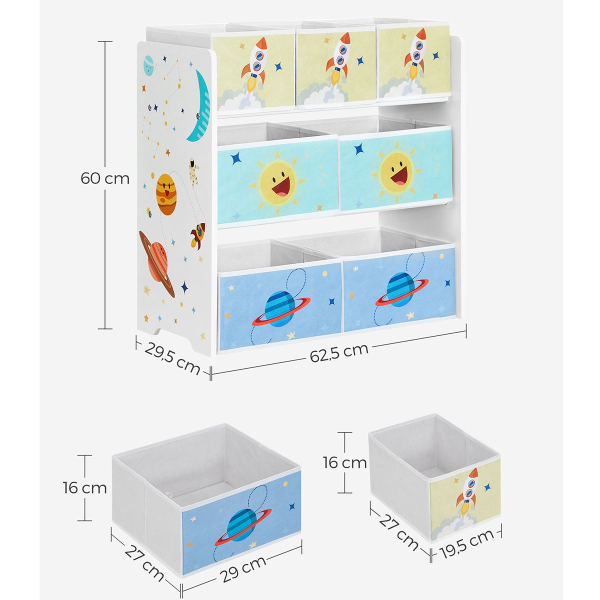 Έπιπλο αποθήκευσης 3 επιπέδων με 7 κουτιά αποθήκευσης από την εταιρεία Songmics. Είναι κατασκευασμένο από ξύλο MDF σε λευκό χρώμα με πολύχρωμες λεπτομέρειες και διαθέτει 7 υφασμάτινα nonwoven κουτιά αποθήκευσης σε λευκό-γαλάζιο-μπλε και κίτρινο χρώμα για να οργανώσετε τον χώρο του παιδικού ή βρεφικού δωματίου. Τα κουτιά είναι αφαιρούμενα γεγονός που σας επιτρέπει να τα μετακινείτε εύκολα σε όποιο ράφι θέλετε ή και εκτός. Στις πλαϊνές μεριές έχει σχέδιο διάστημα. Το ύψος του είναι ιδανικό αφού το καθιστά εύκολα προσβάσιμο στα παιδιά ώστε να μπορεί να μαζεύει μόνο του τα παιχνίδια του, τα αξεσουάρ ή τα βιβλία του. Διαθέτει εξαρτήματα εγκατάστασης τοίχου για αποφυγή ανατροπής και μέγιστη σταθερότητα. Μικρά κουτιά: 27εκ.Μx16.5εκ.Πx16εκ.Υ. Μεγάλα κουτιά: 27εκ.Μx29εκ.Πx16εκ.Υ. *Το προϊόν έρχεται αμοντάριστο και συναρμολογείται βάσει οδηγιών.*