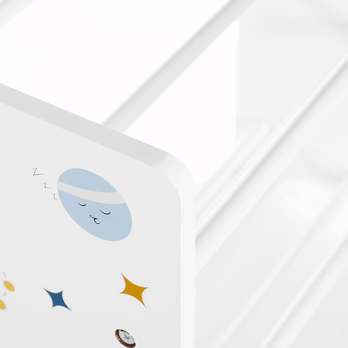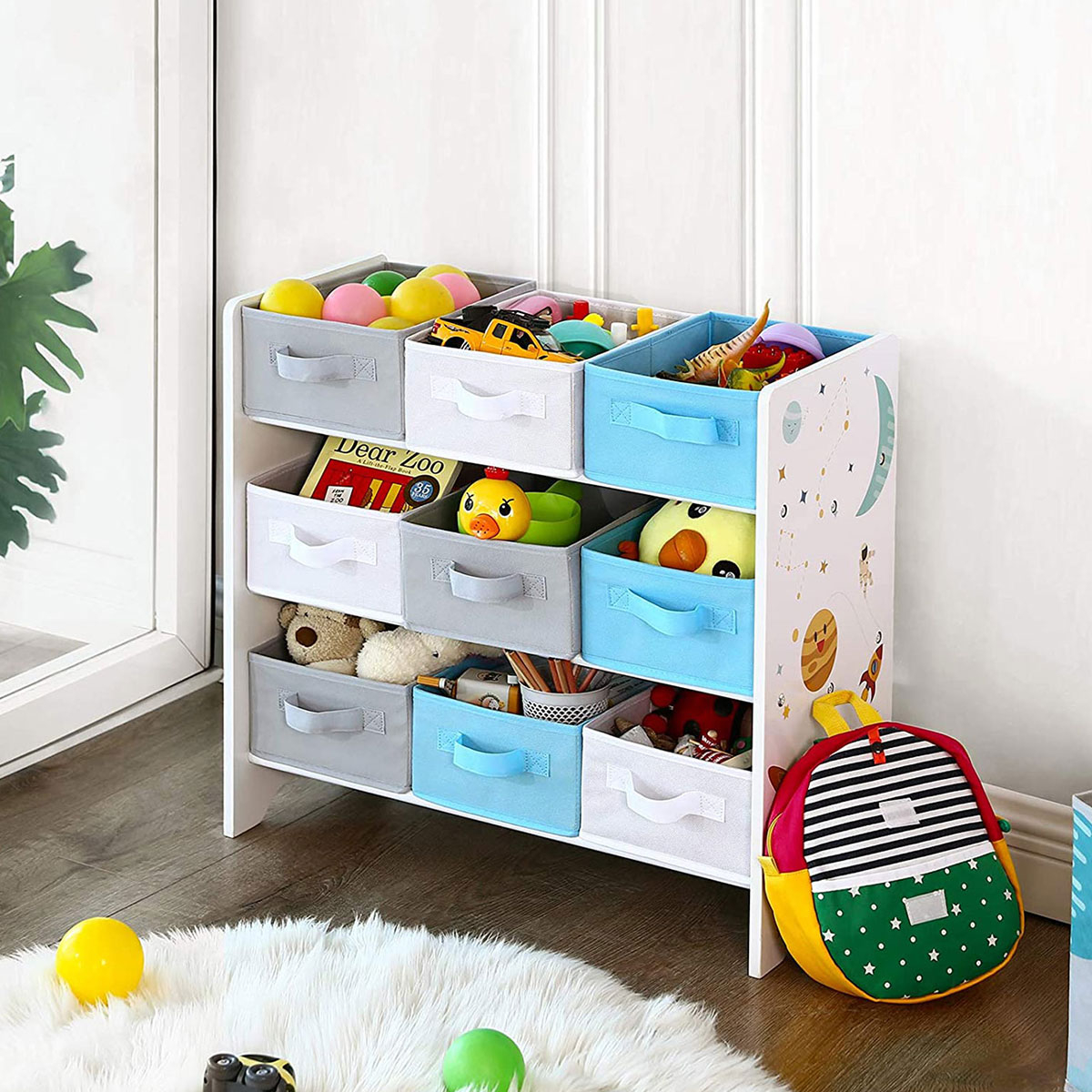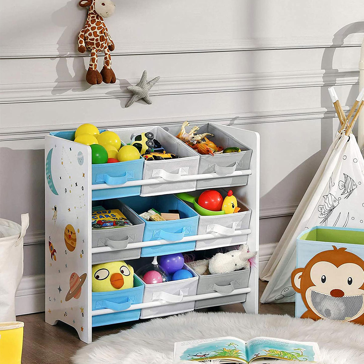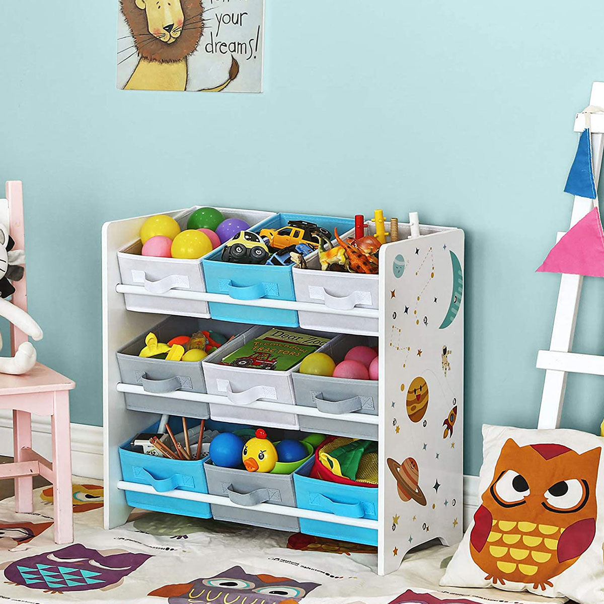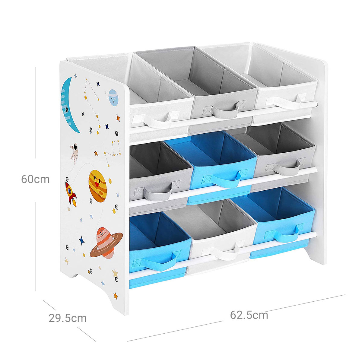 Έπιπλο αποθήκευσης 3 επιπέδων με 9 κουτιά αποθήκευσης από την εταιρεία Songmics. Είναι κατασκευασμένο από μοριοσανίδα σε λευκό χρώμα και διαθέτει 9 υφασμάτινα κουτιά αποθήκευσης σε λευκό-γαλάζιο-γκρι χρώμα για να οργανώσετε τον χώρο του παιδικού ή βρεφικού δωματίου. Τα κουτιά είναι αφαιρούμενα γεγονός που σας επιτρέπει να τα μετακινείτε εύκολα σε όποιο ράφι θέλετε ή και εκτός. Στις πλαϊνές μεριές έχει σχέδιο διάστημα. Το ύψος του είναι ιδανικό αφού το καθιστά εύκολα προσβάσιμο στα παιδιά ώστε να μπορεί να μαζεύει μόνο του τα παιχνίδια του, τα αξεσουάρ ή τα βιβλία του. Διαθέτει εξαρτήματα εγκατάστασης τοίχου για αποφυγή ανατροπής και μέγιστη σταθερότητα. *Το προϊόν έρχεται αμοντάριστο και συναρμολογείται βάσει οδηγιών.*