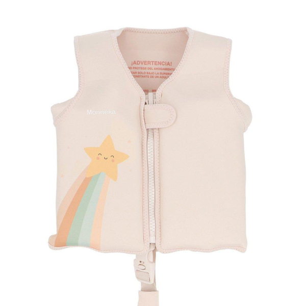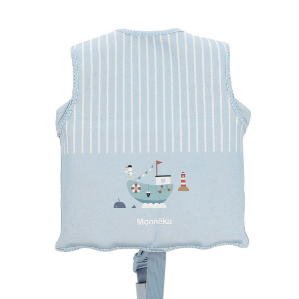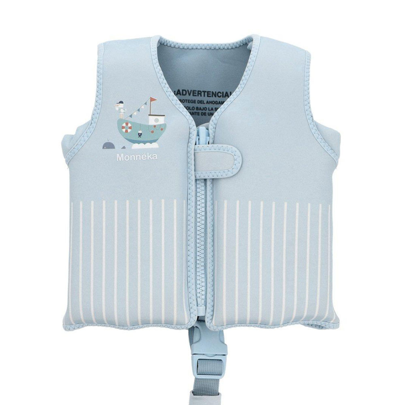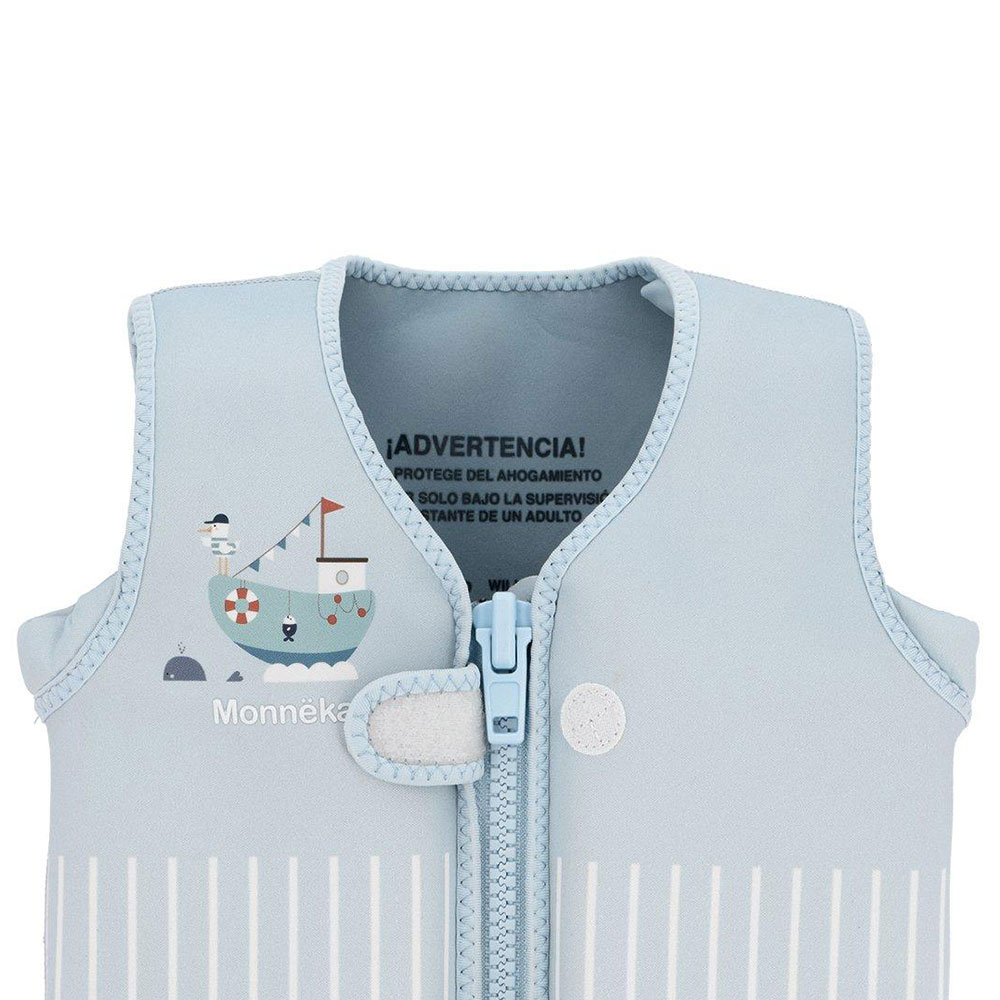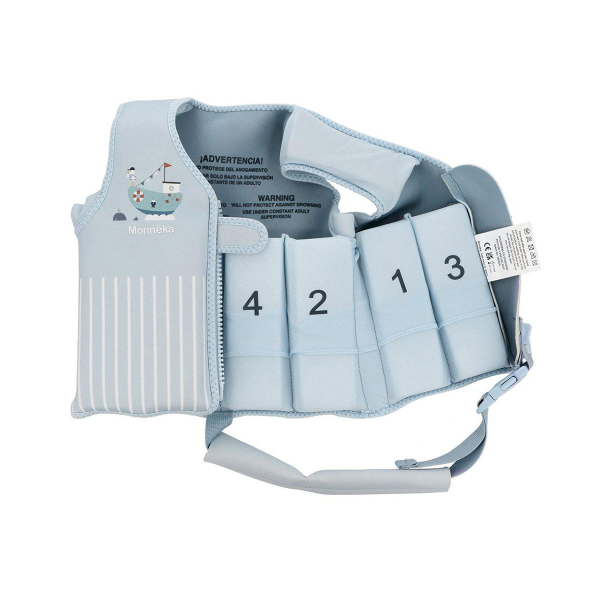 Παιδικό γιλέκο κολύμβησης από την εταιρεία Monneka σε γαλάζιο χρώμα, μοντέρνο σχέδιο και λευκές-μπεζ-βεραμάν-κόκκινες λεπτομέρειες. Είναι κατασκευασμένο από 100% polyester εξωτερικά και διαθέτει 8 κομμάτια επίπλευσης που μπορούν να αφαιρεθούν σιγά σιγά καθώς βελτιώνεται η ικανότητα του μικρού σας να επιπλέει χωρίς βοήθεια, απολαμβάνοντας την παραλία ή την πισίνα. Επίσης διαθέτει ρυθμιζόμενο λουράκι με επένδυση και ασφαλές κλείσιμο για να μπαίνει ανάμεσα στα πόδια, ώστε το γιλέκο να παραμένει στη θέση του και να μην γλιστράει πάνω από το κεφάλι του και επιπλέον επένδυση στην περιοχή της μασχάλης για αποφυγή τριβής. Είναι ευχάριστο και απαλό στην αφή, που το καθιστά πολύ άνετο στη χρήση. Έχει φαρδύ και ανθεκτικό φερμουάρ και εύχρηστα κουμπώματα για να φοριέται και να βγαίνει εύκολα. Κατασκευάστηκε σε συνεργασία με ειδικούς κολυμβητές για να βοηθήσει τα παιδιά στη διαδικασία μάθησης κολύμβησης με πιστοποιητικό EN13138-1:2021 και σήμανση CE. Διατίθεται σε 3 μεγέθη: 1-2 ετών, 2-3 ετών και 3-6 ετών. *Προσοχή! Για την ασφάλεια του παιδιού σας, μην το αφήνετε χωρίς επίβλεψη. Αυτό είναι ένα βοήθημα επίπλευσης και όχι σωσίβιο*