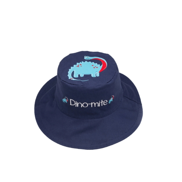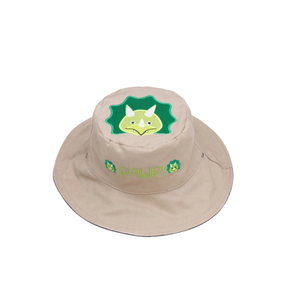 Παιδικό καπέλο διπλής όψης από την εταιρία FlapjackKids. Η μία όψη έχει μπεζ χρώμα, πολύχρωμες λεπτομέρειες και σχέδιο δεινόσαυρο και η άλλη όψη έχει μπλε χρώμα, γαλάζιες λεπτομέρειες και σχέδιο δεινόσαυρο. Είναι ελαφρύ, αδιάβροχο και απαλό, με αντηλιακή προστασία UPF 50+, κατασκευασμένο από 100% βαμβάκι. Ιδανικό για την βόλτα, τις εκδρομές κτλ. Διατίθεται σε Small (6-24 μηνών) με περιφέρεια 20εκ., σε Medium (2-4 ετών) με περιφέρεια 21εκ. και σε Large (4-6 ετών) με περιφέρεια 22εκ.