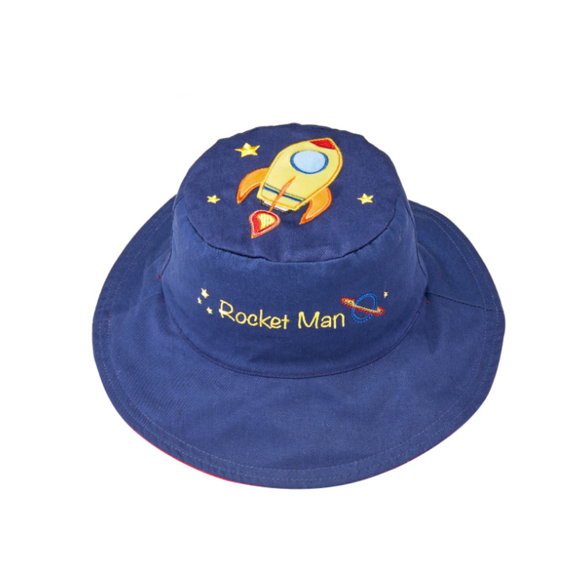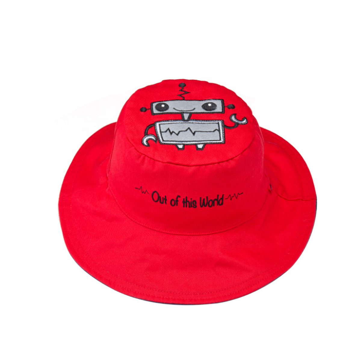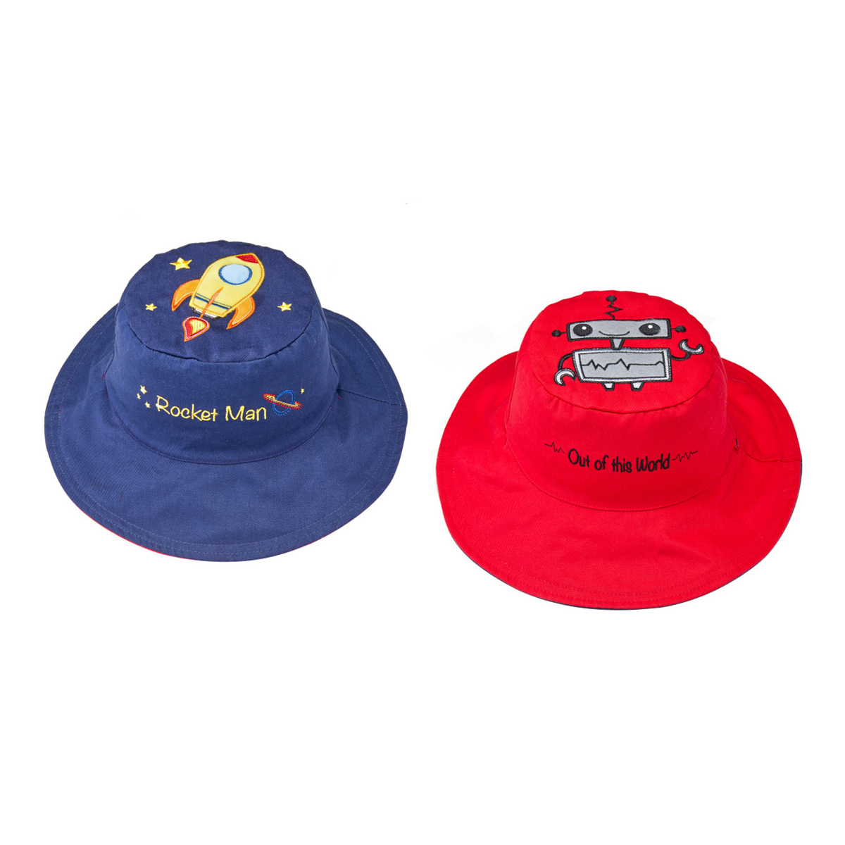 Παιδικό καπέλο διπλής όψης από την εταιρία FlapjackKids. Η μία όψη έχει μπλε χρώμα, πολύχρωμες λεπτομέρειες και σχέδιο διαστημόπλοιο και η άλλη όψη έχει κόκκινο χρώμα, γκρι λεπτομέρειες και σχέδιο ρομπότ. Είναι ελαφρύ, αδιάβροχο και απαλό, με αντηλιακή προστασία UPF 50+, κατασκευασμένο από 100% βαμβάκι. Ιδανικό για την βόλτα, τις εκδρομές κτλ. Διατίθεται σε Small (6-24 μηνών) και σε Medium (2-4 ετών).