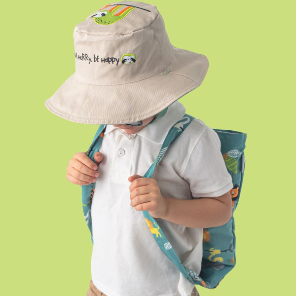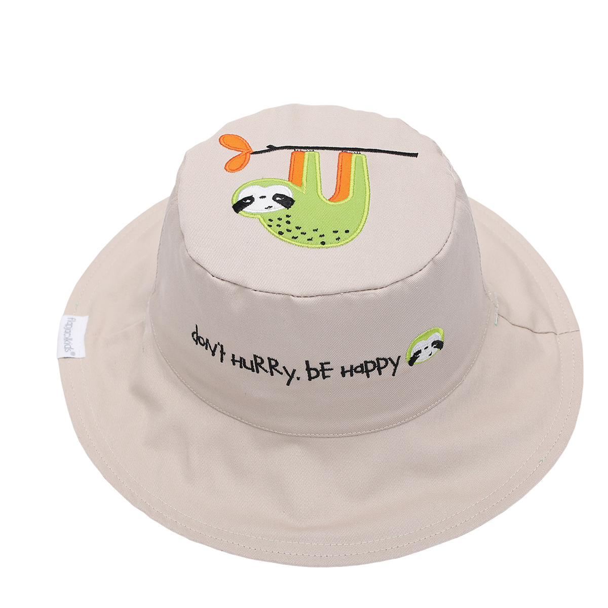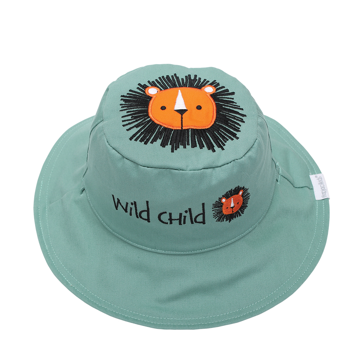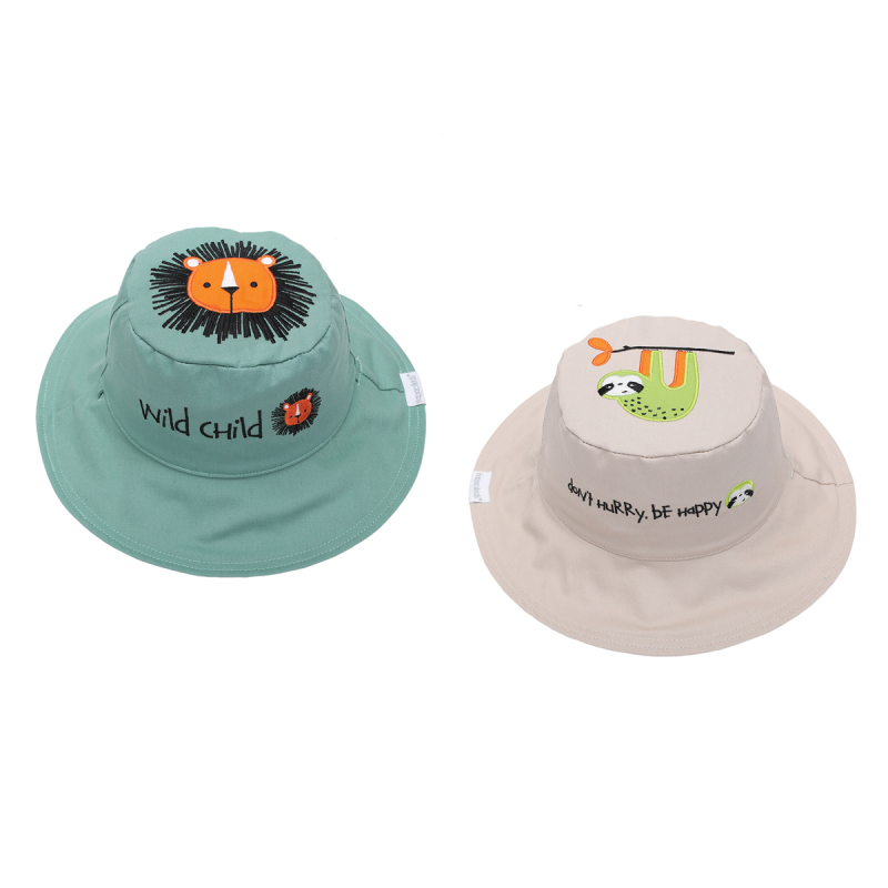Παιδικό καπέλο διπλής όψης από την εταιρία FlapjackKids. Η μία όψη έχει βεραμάν χρώμα, πολύχρωμες λεπτομέρειες και σχέδιο λιονταράκι και η άλλη όψη έχει ροζ χρώμα, πολύχρωμες λεπτομέρειες και σχέδιο βραδύποδα. Είναι ελαφρύ, αδιάβροχο και απαλό, με αντηλιακή προστασία UPF 50+, κατασκευασμένο από 100% βαμβάκι. Ιδανικό για την βόλτα, τις εκδρομές κτλ. Διατίθεται σε Small (6-24 μηνών) και σε Medium (2-4 ετών).