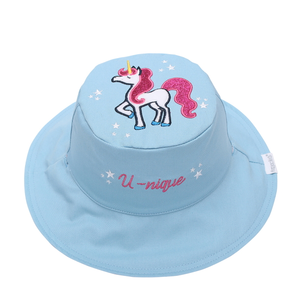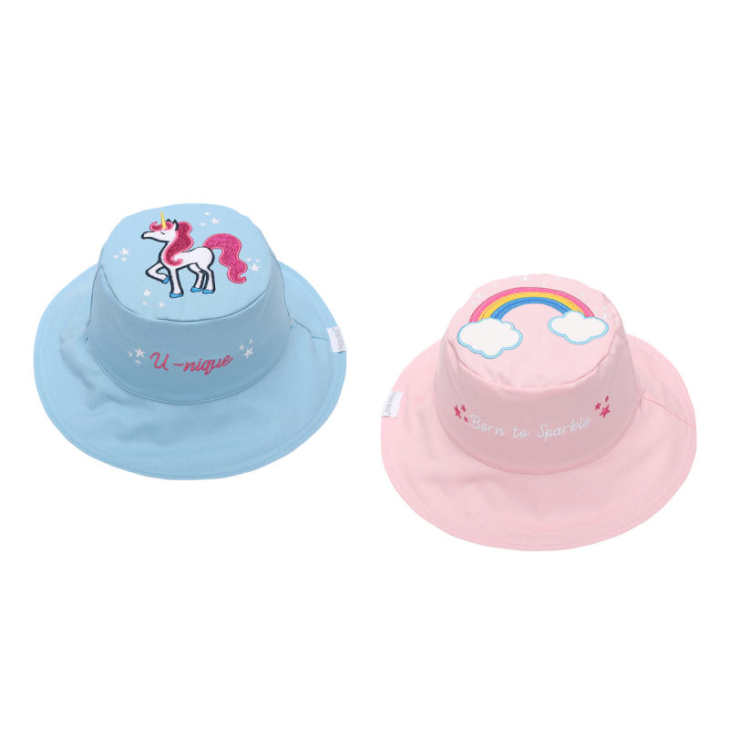 Παιδικό καπέλο διπλής όψης από την εταιρία FlapjackKids. Η μία όψη έχει γαλάζιο χρώμα, πολύχρωμες λεπτομέρειες και σχέδιο μονόκερο και η άλλη όψη έχει ροζ χρώμα, πολύχρωμες λεπτομέρειες και σχέδιο ουράνιο τόξο. Είναι ελαφρύ, αδιάβροχο και απαλό, με αντηλιακή προστασία UPF 50+, κατασκευασμένο από 100% βαμβάκι. Ιδανικό για την βόλτα, τις εκδρομές κτλ. Διατίθεται σε Small (6-24 μηνών), σε Medium (2-4 ετών) και σε Large (4-6 ετών).