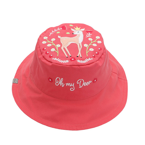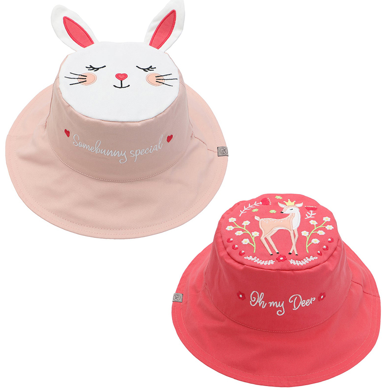 Παιδικό καπέλο διπλής όψης από την εταιρία FlapjackKids. Η μία όψη έχει εκρού χρώμα, πολύχρωμες λεπτομέρειες και σχέδιο λαγουδάκι και η άλλη όψη έχει κόκκινο χρώμα, πολύχρωμες λεπτομέρειες και σχέδιο ελαφάκι. Είναι ελαφρύ, αδιάβροχο και απαλό, με αντηλιακή προστασία UPF 50+, κατασκευασμένο από 100% βαμβάκι. Ιδανικό για την βόλτα, τις εκδρομές κτλ. Διατίθεται σε Small (6-24 μηνών) με περιφέρεια 20εκ., σε Medium (2-4 ετών) με περιφέρεια 21εκ. και σε Large (4-6 ετών) με περιφέρεια 22εκ.