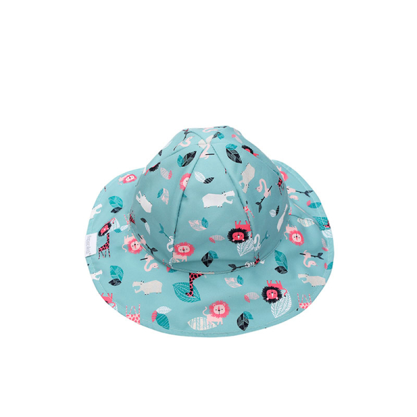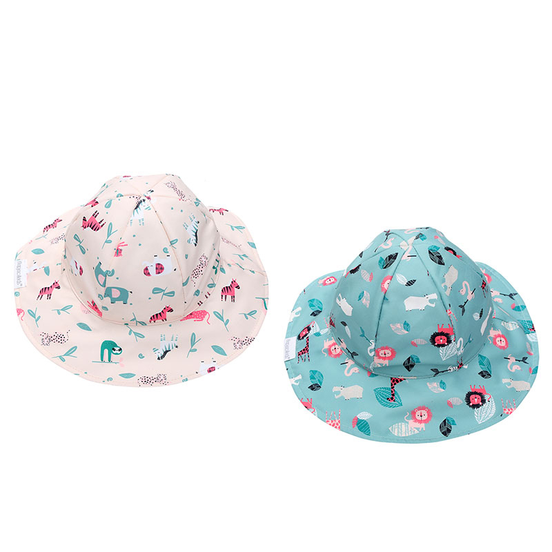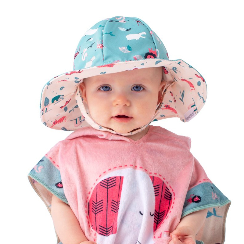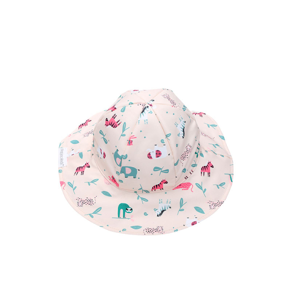 Παιδικό καπέλο διπλής όψης από την εταιρία FlapjackKids. Η μία όψη έχει γαλάζιο χρώμα, πολύχρωμες λεπτομέρειες και σχέδιο ζωάκια και η άλλη όψη έχει ροζ χρώμα, πολύχρωμες λεπτομέρειες και σχέδιο χρώμα. Είναι ελαφρύ, αδιάβροχο και απαλό, με αντηλιακή προστασία UPF 50+, κατασκευασμένο από 100% polyester. Ιδανικό για την βόλτα, τις εκδρομές κτλ. Διατίθεται σε Small (6-24 μηνών) και σε Medium (2-4 ετών).