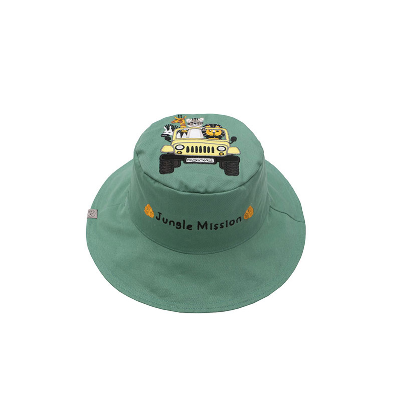 Παιδικό καπέλο διπλής όψης από την εταιρία FlapjackKids. Η μία όψη έχει γκρι χρώμα, μαύρες-λευκές λεπτομέρειες και σχέδιο τίγρη και η άλλη όψη έχει πράσινο χρώμα, πολύχρωμες λεπτομέρειες και μοντέρνο σχέδιο. Είναι ελαφρύ, αδιάβροχο και απαλό, με αντηλιακή προστασία UPF 50+, κατασκευασμένο από 100% βαμβάκι. Ιδανικό για την βόλτα, τις εκδρομές κτλ. Διατίθεται σε Small (6-24 μηνών) με περιφέρεια 20εκ., σε Medium (2-4 ετών) με περιφέρεια 21εκ. και σε Large (4-6 ετών) με περιφέρεια 22εκ.