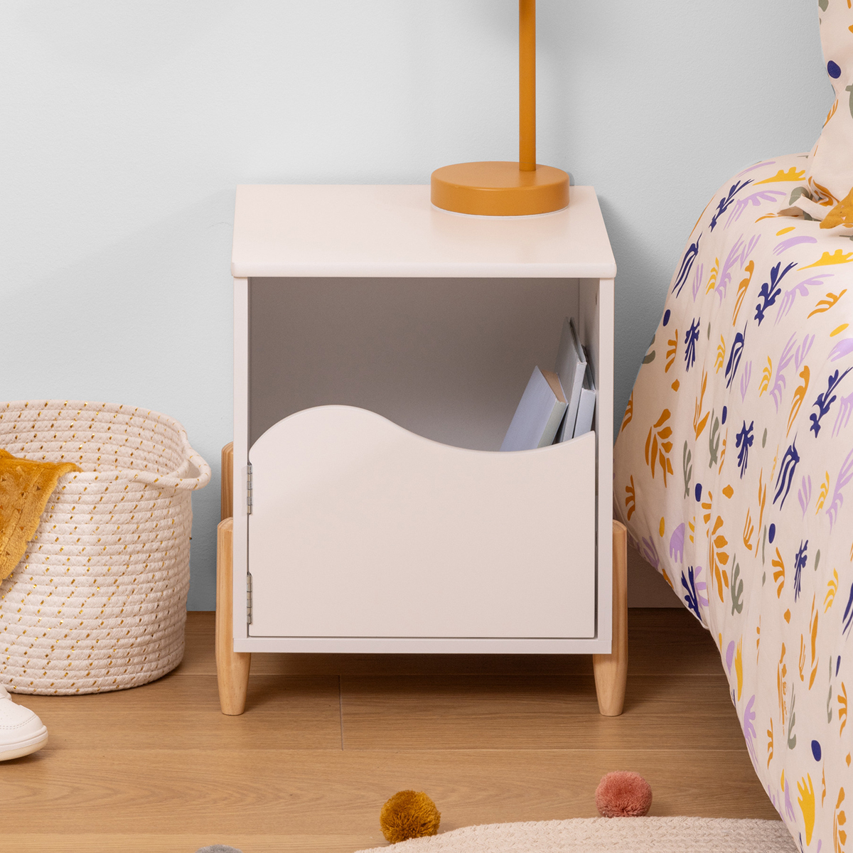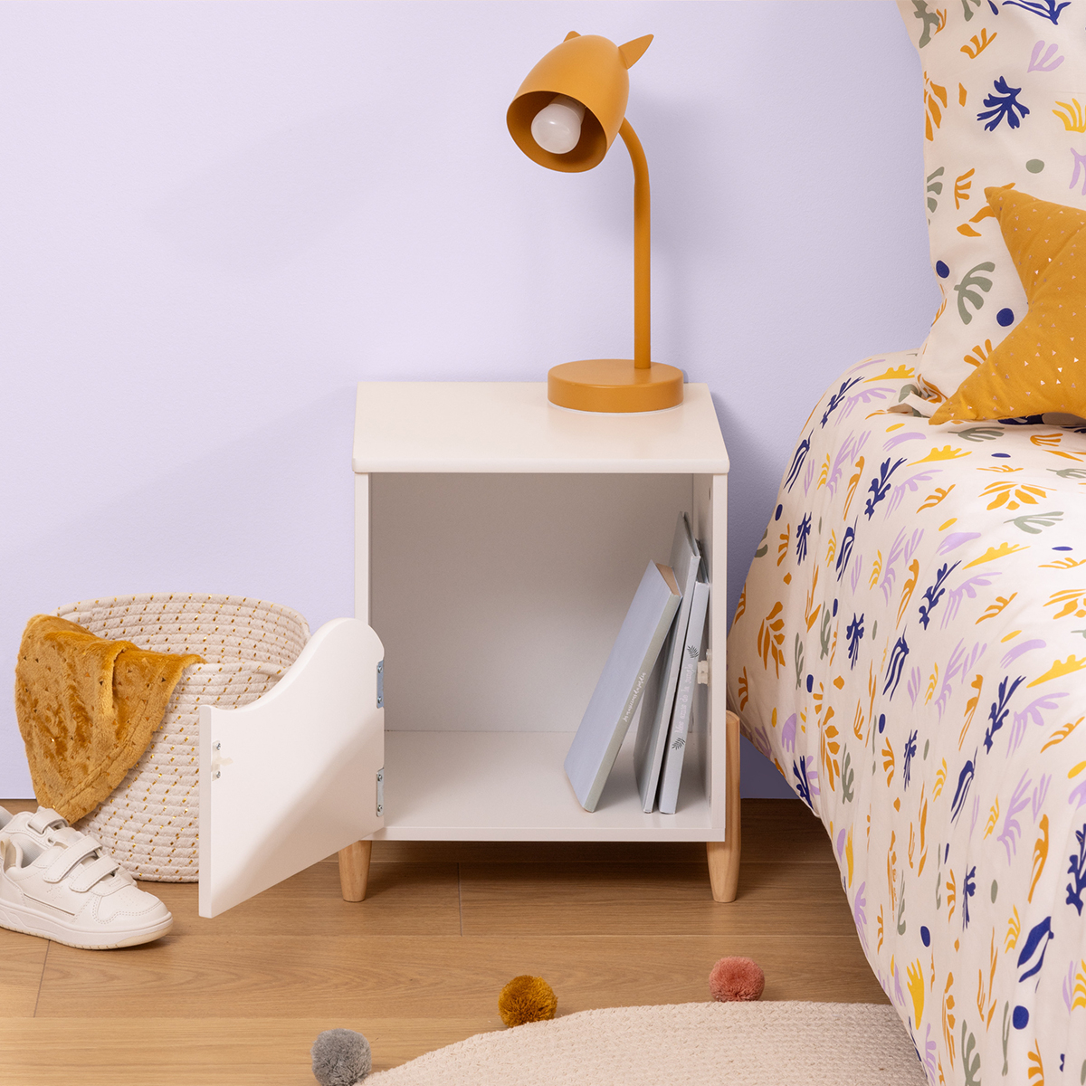 Παιδικό κομοδίνο που θα ταιριάξει μοναδικά στο παιδικό δωμάτιο. Ο σκελετός είναι κατασκευασμένος από ξύλο MDF_E1 σε λευκό χρώμα. Διαθέτει ντουλαπάκι που ανοίγει από την μπροστινή μεριά για να τοποθετήσει το παιδί σας τα πράγματά του. Το προϊόν έρχεται αμοντάριστο και συναρμολογείται βάσει οδηγιών.