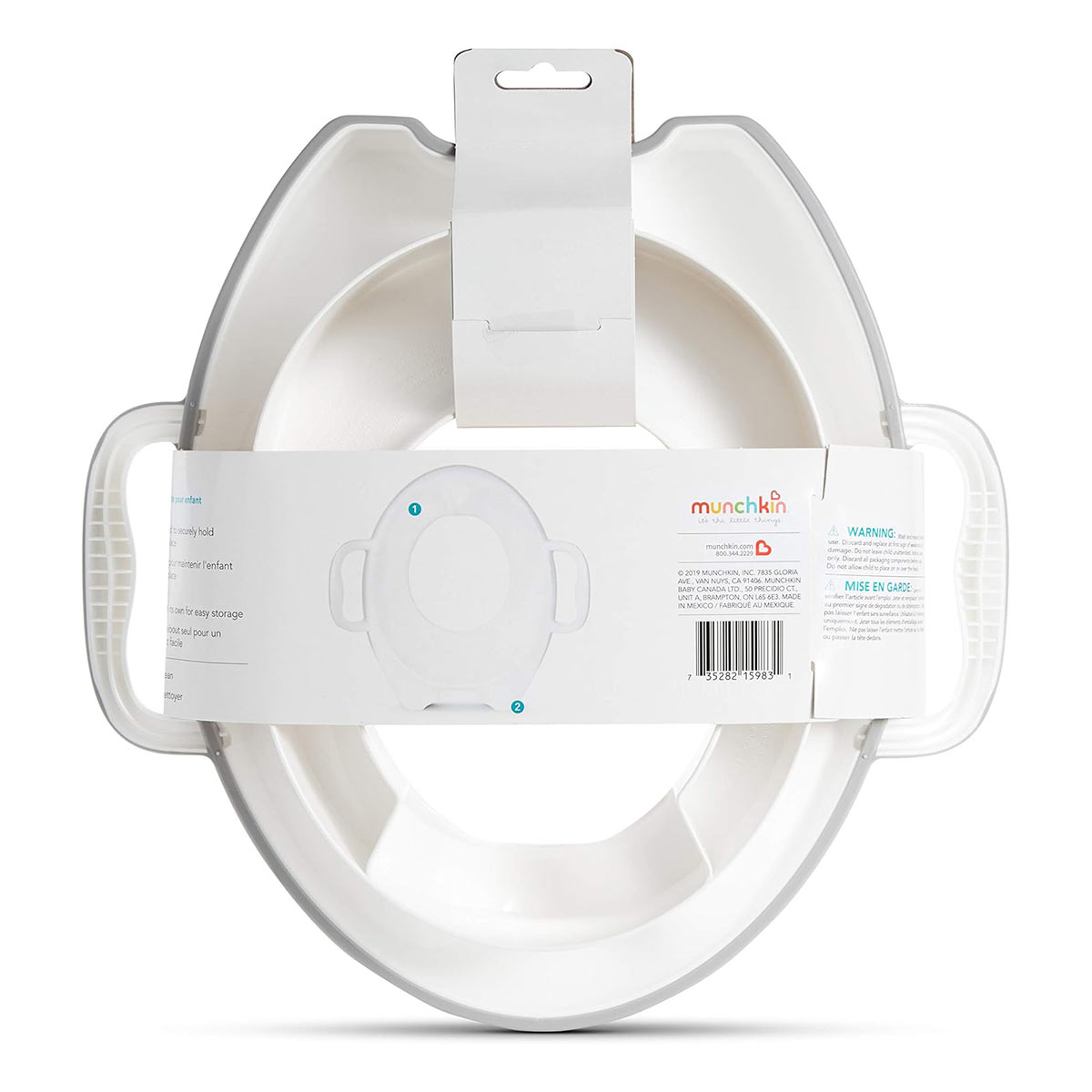Παιδικό εκπαιδευτικό κάθισμα τουαλέτας σε λευκό χρώμα από την εταιρεία Munchkin. Ταιριάζει στα περισσότερα καθίσματα τουαλέτας και έχει αντιολισθητικό περίγραμμα που το κρατά στην θέση του. Έχει λαβές με εύκολο κράτημα για επιπλέον σταθερότητα. Διαθέτει προστατευτικό ούρησης στο μπροστινό μέρος και οπή για να το κρεμάτε όταν δεν το χρησιμοποιείτε.