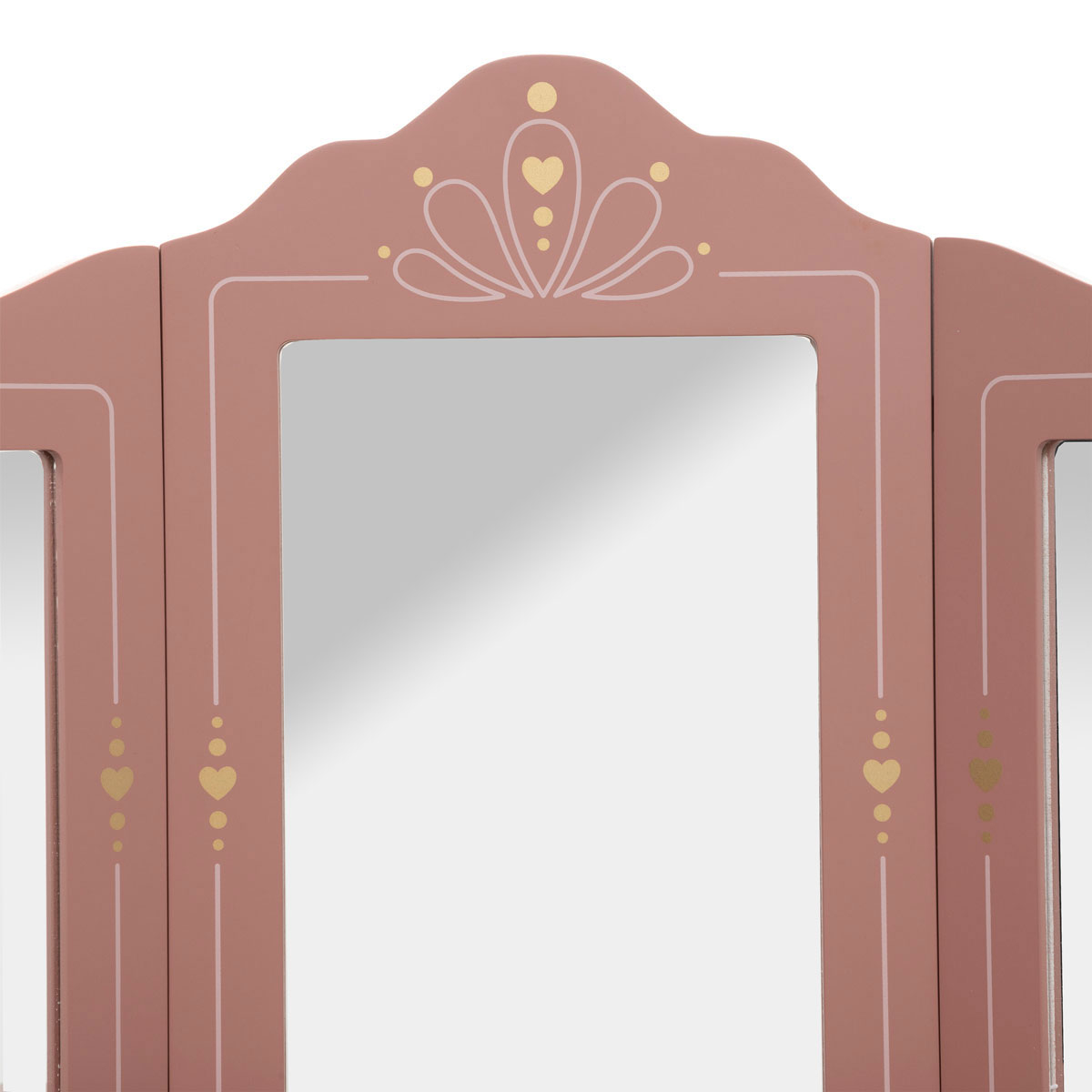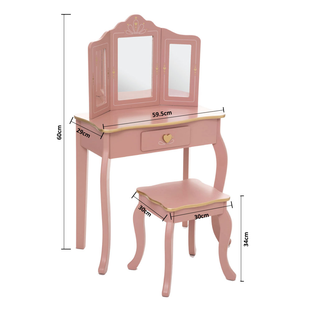 Τουαλέτα ομορφιάς με σκαμπό ιδανικά για το παιδικό δωμάτιο. Είναι κατασκευασμένα από ξύλο MDF_E1 σε ροζ απόχρωση με χρυσές λεπτομέρειες και καθρέφτη. Κατάλληλα για την προετοιμασία πριν το σχολείο, την βόλτα ή το παιχνίδι. Το προϊόν έρχεται αμοντάριστο και συναρμολογείται βάσει οδηγιών.