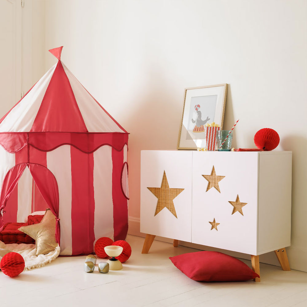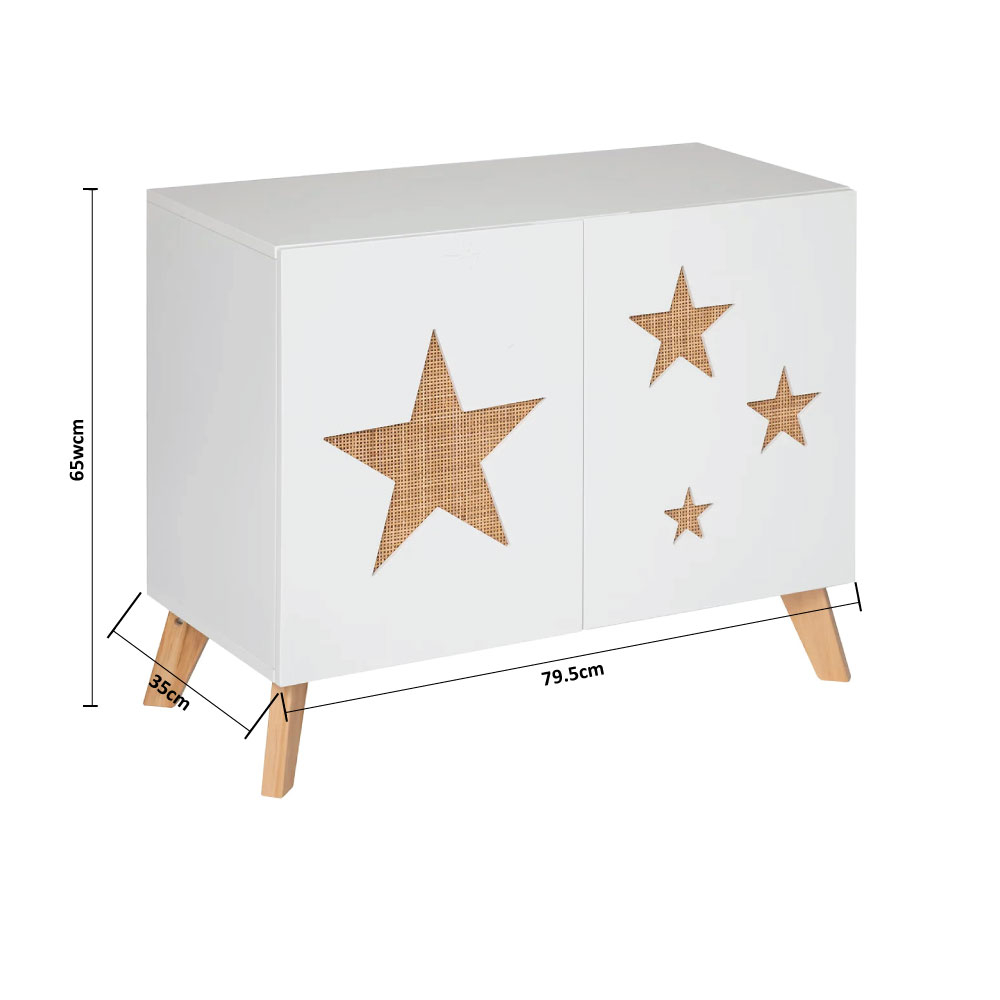 Ντουλάπι για το παιδικό-βρεφικό δωμάτιο με 3 αποθηκευτικούς χώρους. Κατασκευασμένο από ξύλο MDF, με πόδια από ξύλο πεύκου, σε λευκή απόχρωση με καφέ σχέδιο αστεράκια. Ειδικά σχεδιασμένο για να μπορεί το μικρό σας να το ανοίγει μόνο του για να μπορεί να αποθηκεύει τα δικά του αντικείμενα. Το προϊόν έρχεται αμοντάριστο και συναρμολογείται βάσει οδηγιών.