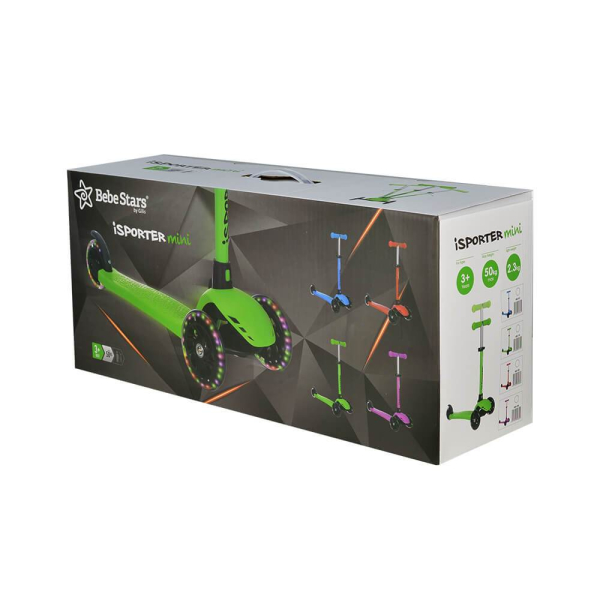 Πατίνι παιδικό της εταιρείας Bebe Stars σε λαχανί χρώμα. Κατάλληλο για παιδιά από 3 ετών και μέγιστο βάρος 50kg. Ξεχωρίζει για την ποιότητα, τον καινοτόμο σχεδιασμό και το σύγχρονο design. Αποτελεί την ιδανική επιλογή για παιδιά που ξεκινούν το scooting, προσφέροντας ασφάλεια και ευελιξία με το σύστημα δύο τροχών εμπρός (Φ13x2.5εκ) και μονό τροχό πίσω (Φ10x2.5εκ.), ο οποίος διαθέτει ειδικό φρένο. Το ειδικά σχεδιασμένο σύστημα εμπρόσθιων τροχών κλίνει προς το μέρος που ορίζει το παιδί με το τιμόνι, προσφέροντας μεγαλύτερη ευελιξία που βοηθά το παιδί να αναπτύξει τις κινητικές του δεξιότητες, την ισορροπία του και το συνολικό συντονισμό του σώματός του μέσα από το παιχνίδι. Το τιμόνι ρυθμίζεται καθ' ύψος από 56 έως 70εκ. σύμφωνα με το ύψος του παιδιού ακολουθώντας την ανάπτυξή του. Διαθέτει ειδικά LED φώτα στους τροχούς, τα οποία εκτός από εντυπωσιακή εμφάνιση, προσφέρουν ασφάλεια βελτιώνοντας την ορατότητα στο σκοτάδι. Kκατασκευασμένο σύμφωνα με τις Ευρωπαϊκές προδιαγραφές ΕΝ71 και με πιστοποίηση CΕ. Διπλώνει για να αποθηκεύεται και να μεταφέρεται εύκολα.