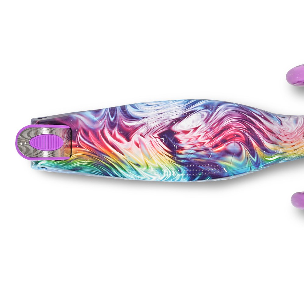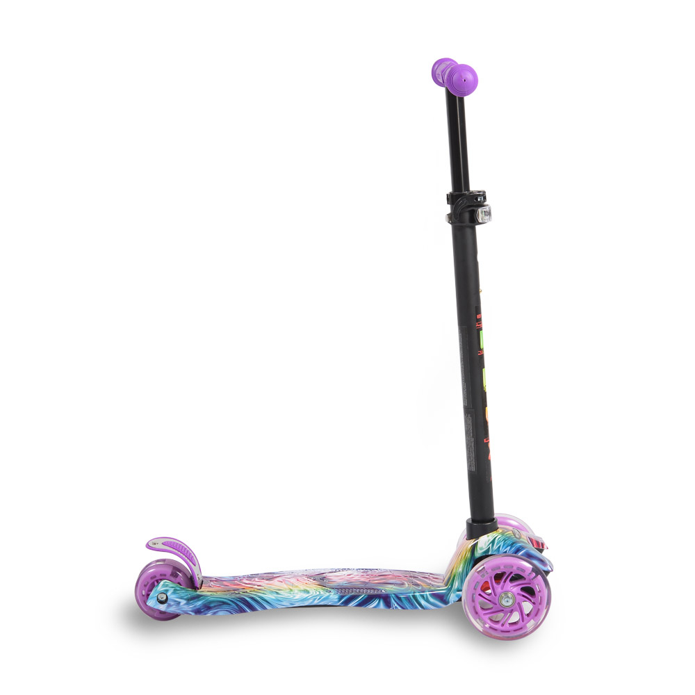 Πατίνι παιδικό της εταιρείας Byox. Η βάση του έχει μοντέρνο σχέδιο σε λιλά-πολύχρωμες αποχρώσεις και είναι τυπωμένο με χρώματα που έχουν ως βάση το νερό. Κατάλληλο για παιδιά από 3 ετών και μέγιστο βάρος 40kg. Ιδανικό για παιδιά που ξεκινούν το scooting, προσφέροντας ασφάλεια και ευελιξία με το σύστημα δύο τροχών εμπρός (Φ12x3εκ) και μονό τροχό πίσω (Φ8x3εκ.), ο οποίος διαθέτει φρένο. Το σύστημα εμπρόσθιων τροχών κλίνει προς το μέρος που ορίζει το παιδί με το τιμόνι, προσφέροντας μεγαλύτερη ευελιξία που βοηθά το παιδί να αναπτύξει τις κινητικές του ικανότητες, την ισορροπία και τον συγχρονισμό του σώματός του μέσα από το παιχνίδι. Το τιμόνι έχει ρυθμιζόμενο ύψος για να προσαρμόζεται στο ύψος του παιδιού ακολουθώντας την ανάπτυξή του. Διαθέτει LED φωτάκια στους τροχούς, τα οποία εκτός βελτιώνουν την ορατότητα στο σκοτάδι.
