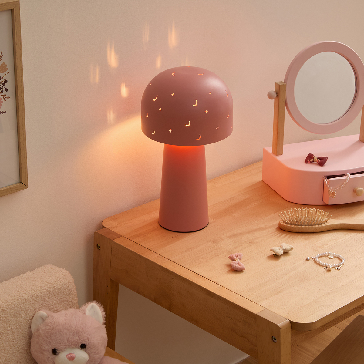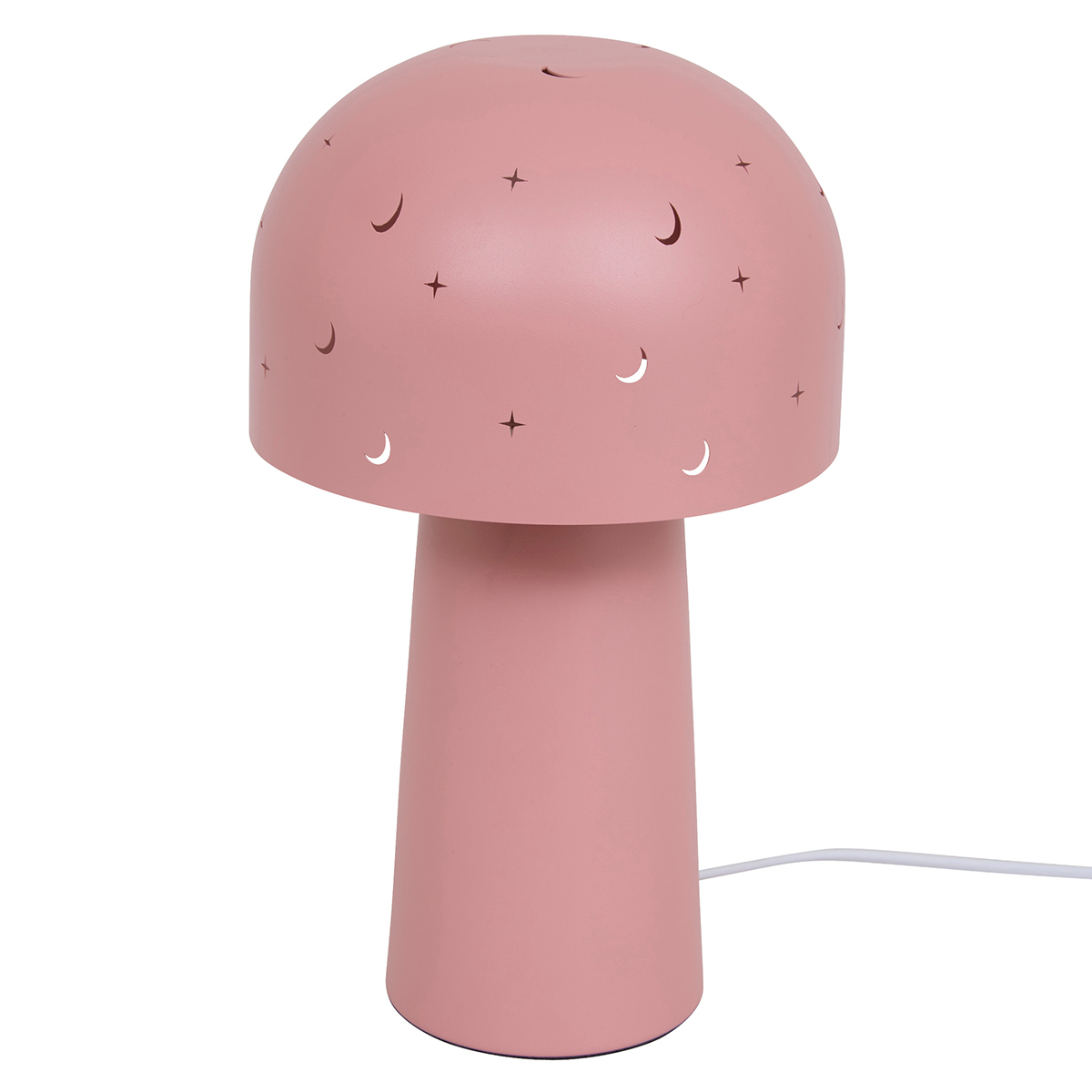 Επιτραπέζιο φωτιστικό ιδανικό για το βρεφικό ή παιδικό δωμάτιο. Είναι κατασκευασμένο από μεταλλικό υλικό σε ροζ χρώμα. Το καπέλο είναι διάτρητο με φεγγαράκια και αστεράκια. Διαθέτει καλώδιο για παροχή ρεύματος 1.5 μέτρο. Τύπος ντουί: 1xE14 και θέση για 1 λαμπτήρα έως 25W (δεν συμπεριλαμβάνεται).