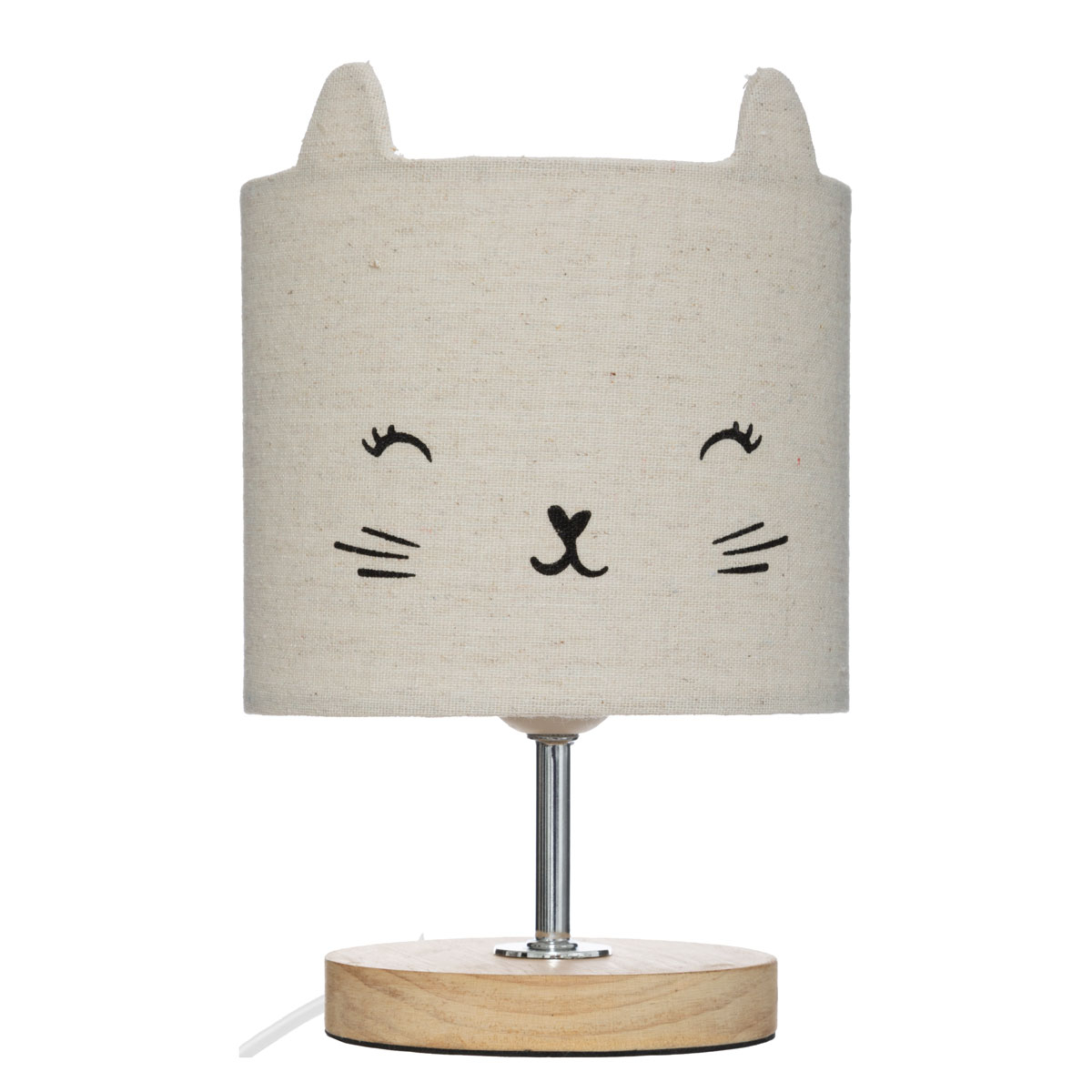 Επιτραπέζιο φωτιστικό ιδανικό για το βρεφικό ή παιδικό δωμάτιο. Έχει ξύλινη βάση σε φυσική απόχρωση και ασημί μεταλλικό σκελετό. Το καπέλο είναι υφασμάτινο σε εκρού απόχρωση με μαύρο σχέδιο γατάκι. Διαθέτει καλώδιο 1,5 μέτρου για παροχή ρεύματος. Τύπος ντουί: 1xE14 και θέση για 1 λαμπτήρα έως 25W (δεν συμπεριλαμβάνεται).