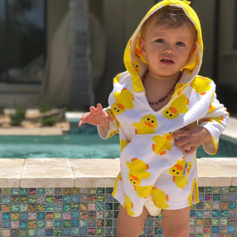 Παιδικό πόντσο με αντιηλιακή προστασία, σε λευκό φόντο, κίτρινες λεπτομέρειες και σχέδιο παπάκια από την εταιρία Zoocchini. Είναι κατασκευασμένο από 80% βαμβάκι και 20% polyester χωρίς αζοχρώματα και φορμαλδεΰδη, ενώ έχει πιστοποιημένη προστασία UPF50+ που θα προστατεύσει το μικρό σας από τις βλαβερές ακτίνες του ήλιου. Έχει μακριά μανίκια, άνετη κουκούλα και μπροστινή τσέπη. Η κουκούλα έχει απορροφητικό ύφασμα στην εσωτερική μεριά ενώ εξωτερικά είναι από ύφασμα ζέρσεϊ για να κρατάει το κεφαλάκι του μικρού σας στεγνό. Αποτελεί ένα πολύ μαλακό και απορροφητικό πόντσο που θα κρατήσει το παιδί σας στεγνό και προστατευμένο από τον ήλιο. Ιδανικό για την παραλία, την πίσινα, το πικ-νικ. Διατίθεται για ηλικίες 12 έως 24 μηνών με ύψος 78-94εκ., κιλά 10-13. Το μήκος κορμού είναι 39εκ. και του μανικιού 19.7εκ.
