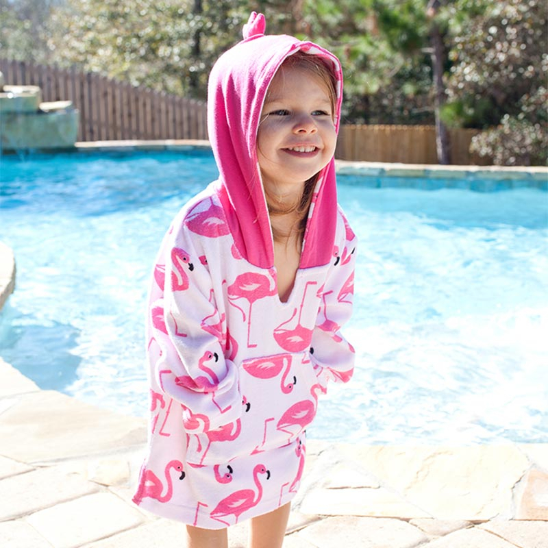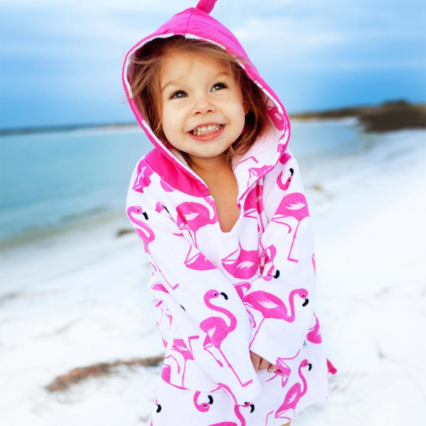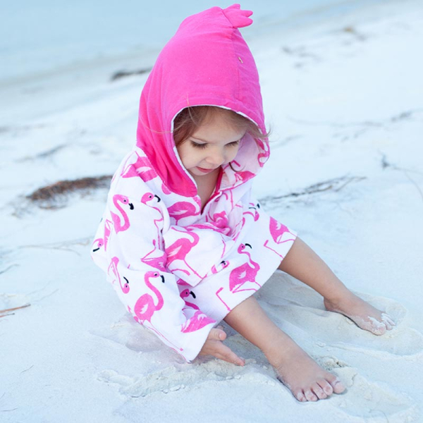 Παιδικό πόντσο με αντιηλιακή προστασία, σε λευκό φόντο, φούξια λεπτομέρειες και σχέδιο φλαμίνγκο από την εταιρία Zoocchini. Είναι κατασκευασμένο από 80% βαμβάκι και 20% polyester χωρίς αζοχρώματα και φορμαλδεΰδη, ενώ έχει πιστοποιημένη προστασία UPF50+ που θα προστατεύσει το μικρό σας από τις βλαβερές ακτίνες του ήλιου. Έχει μακριά μανίκια, άνετη κουκούλα και μπροστινή τσέπη. Η κουκούλα έχει απορροφητικό ύφασμα στην εσωτερική μεριά ενώ εξωτερικά είναι από ύφασμα ζέρσεϊ για να κρατάει το κεφαλάκι του μικρού σας στεγνό. Αποτελεί ένα πολύ μαλακό και απορροφητικό πόντσο που θα κρατήσει το παιδί σας στεγνό και προστατευμένο από τον ήλιο. Ιδανικό για την παραλία, την πίσινα, το πικ-νικ. Διατίθεται για ηλικίες 0 έως 12 μηνών με ύψος 68-78εκ., κιλά 7-10. Το μήκος κορμού είναι 34εκ. και του μανικιού 18.5εκ.