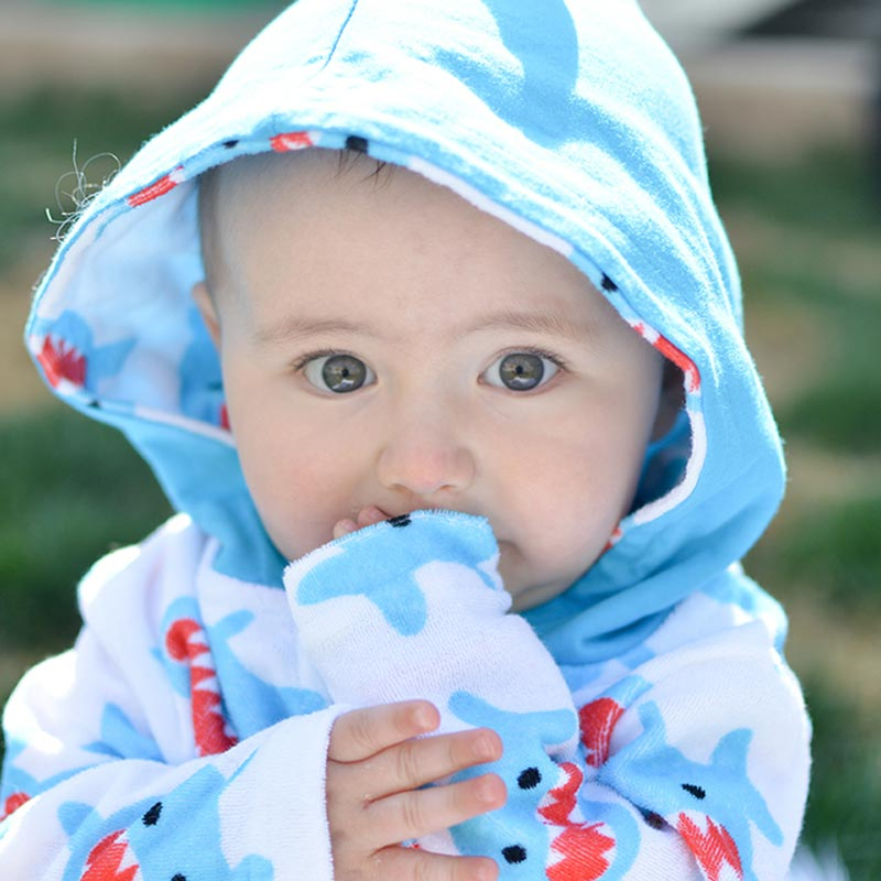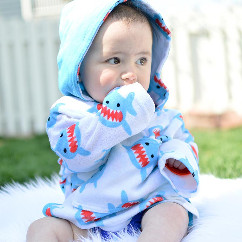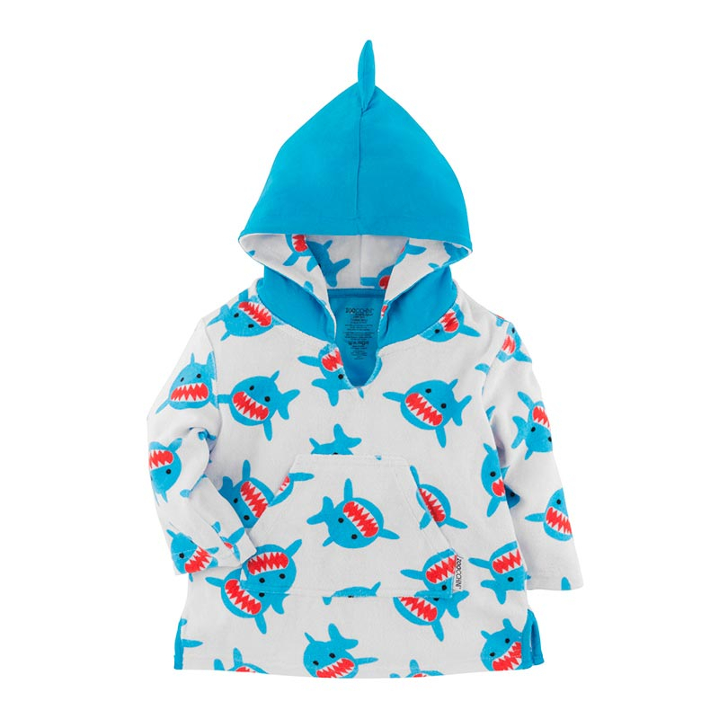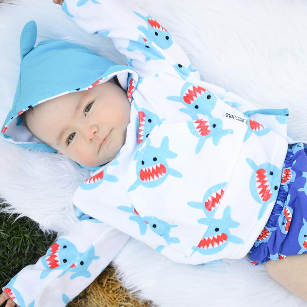 Παιδικό πόντσο με αντιηλιακή προστασία, σε λευκό φόντο, γαλάζιες λεπτομέρειες και σχέδιο καρχαρία από την εταιρία Zoocchini. Είναι κατασκευασμένο από 80% βαμβάκι και 20% polyester χωρίς αζοχρώματα και φορμαλδεΰδη, ενώ έχει πιστοποιημένη προστασία UPF50+ που θα προστατεύσει το μικρό σας από τις βλαβερές ακτίνες του ήλιου. Έχει μακριά μανίκια, άνετη κουκούλα και μπροστινή τσέπη. Η κουκούλα έχει απορροφητικό ύφασμα στην εσωτερική μεριά ενώ εξωτερικά είναι από ύφασμα ζέρσεϊ για να κρατάει το κεφαλάκι του μικρού σας στεγνό. Αποτελεί ένα πολύ μαλακό και απορροφητικό πόντσο που θα κρατήσει το παιδί σας στεγνό και προστατευμένο από τον ήλιο. Ιδανικό για την παραλία, την πίσινα, το πικ-νικ. Διατίθεται για ηλικίες 0 έως 12 μηνών με ύψος 68-78εκ., κιλά 7-10. Το μήκος κορμού είναι 34εκ. και του μανικιού 18.5εκ.