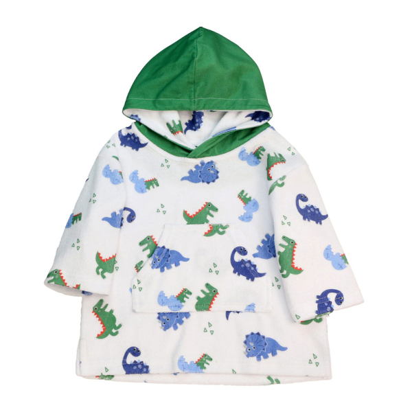 Παιδικό πόντσο με αντιηλιακή προστασία, σε λευκό φόντο, με μπλε-πράσινες λεπτομέρειες και σχέδιο δεινόσαυρους από την εταιρία Zoocchini. Είναι κατασκευασμένο από 80% βαμβάκι και 20% polyester χωρίς αζοχρώματα και φορμαλδεΰδη, ενώ έχει πιστοποιημένη προστασία UPF50+ που θα προστατεύσει το μικρό σας από τις βλαβερές ακτίνες του ήλιου. Έχει μακριά μανίκια, άνετη κουκούλα και μπροστινή τσέπη. Η κουκούλα έχει απορροφητικό ύφασμα στην εσωτερική μεριά ενώ εξωτερικά είναι από ύφασμα ζέρσεϊ για να κρατάει το κεφαλάκι του μικρού σας στεγνό. Αποτελεί ένα πολύ μαλακό και απορροφητικό πόντσο που θα κρατήσει το παιδί σας στεγνό και προστατευμένο από τον ήλιο. Ιδανικό για την παραλία, την πίσινα, το πικ-νικ. Διατίθεται για ηλικίες 12 έως 24 μηνών με ύψος 78-94εκ., κιλά 10-13. Το μήκος κορμού είναι 39εκ. και του μανικιού 19.7εκ.