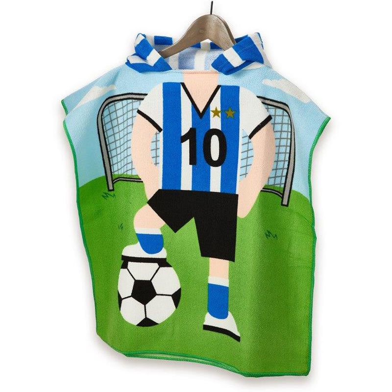 Παιδικό πόντσο σε πράσινο χρώμα, με γαλάζιες λεπτομέρειες και σχέδιο ποδοσφαιριστής από την εταιρεία Whitegg. Έχει πετσετέ υφή και είναι κατασκευασμένο από 100% microfiber με απορροφητικά νήματα, που το καθιστούν απαλό στην αφή και ανθεκτικό στη χρήση.