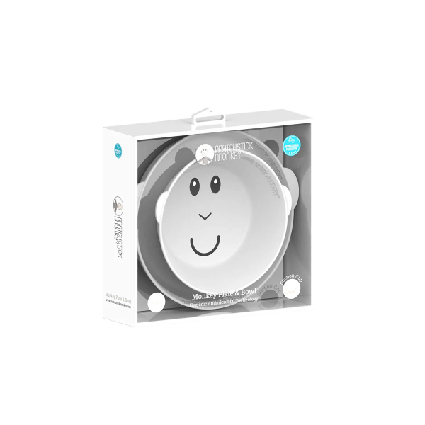Παιδικό σετ φαγητού σε γκρι χρώμα και σχέδιο το πρόσωπο της αγαπημένης μαϊμούς της εταιρείας Matchstick Monkey. Το σετ περιλαμβάνει ένα πιάτο και ένα μπολ τα οποία διαθέτουν αντιολισθητική βάση βεντούζας, για αποφυγή ατυχημάτων κατά τη διάρκεια του φαγητού. Κατασκευασμένο από ανθεκτική σιλικόνη κατάλληλη για τρόφιμα, χωρίς ΒPA και τοξικά, φιλικά προς το περιβάλλον. Διαθέτει την αντιμικροβιακή τεχνολογία BioCote®, που βοηθάει στο να παραμένει υγιεινό και καθαρό. Κατάλληλο για πλύσιμο στο πλυντήριο και για φούρνο μικροκυμάτων. Για ηλικίες 6+ μηνών και άνω.