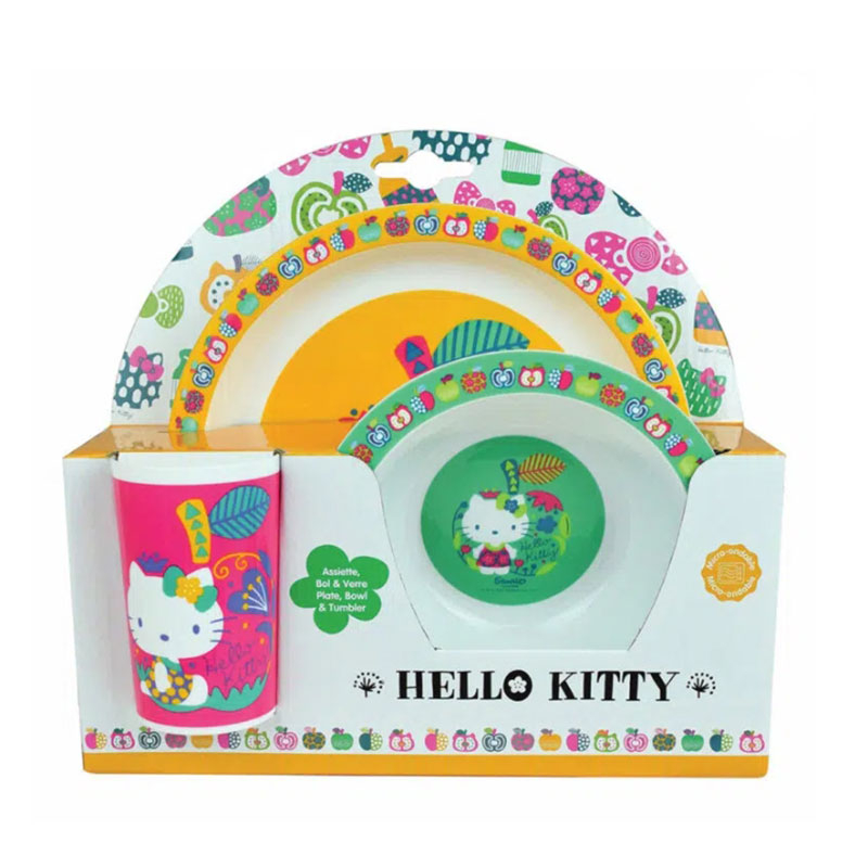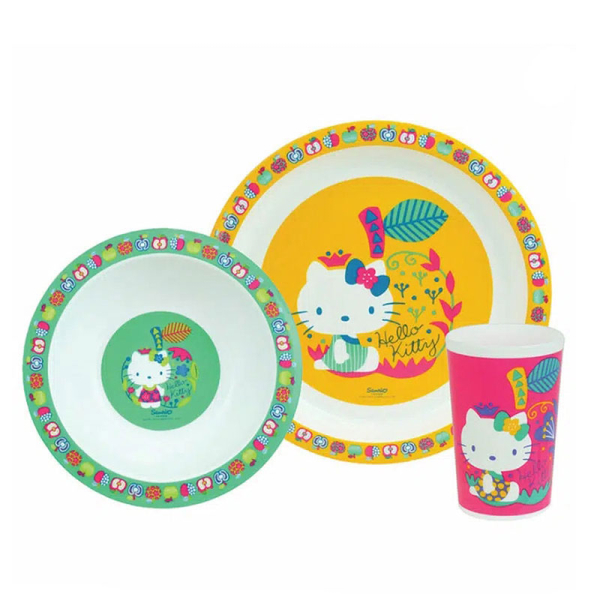 Σετ φαγητού 3 τεμαχίων από την εταιρεία Ango με λευκό φόντο και πολύχρωμες λεπτομέρειες. Έχουν σχέδιο με θέμα την Hello Kitty, ανεξίτηλης εκτύπωσης. Χάρη στην ποιότητα κατασκευής τους από πολυπροπυλένιο χωρίς BPA, είναι ελαφριά, εύχρηστα και ασφαλή για το παιδί. Είναι ανθεκτικά στην καθημερινή χρήση, στις γρατζουνιές και στις πτώσεις, συνδυάζοντας πρακτικότητα και ασφάλεια κατά την διάρκεια του φαγητού. Αποτελούν ιδανική επιλογή για να ξεκινήσει το παιδί να τρώει μόνο του. Είναι κατάλληλα για φούρνο μικροκυμάτων και πλένονται άφοβα στο πλυντήριο πιάτων. Κατάλληλα για ηλικίες από 6 μηνών. Συσκευασία κουτί.