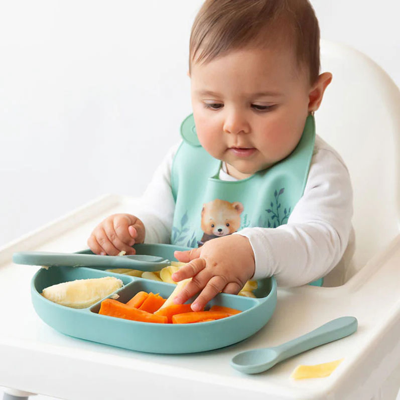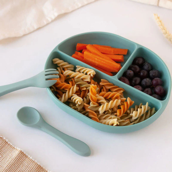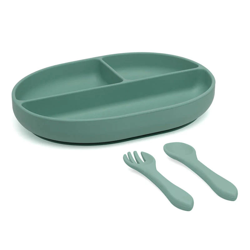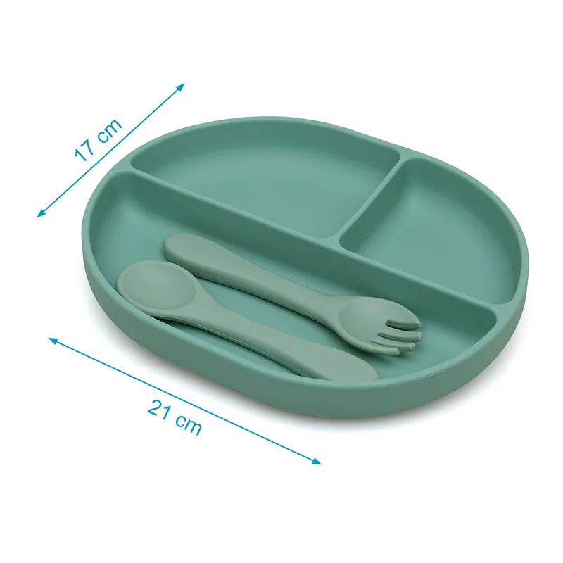 Σετ φαγητού από την εταιρεία Kiokids σε πράσινο χρώμα. Είναι κατασκευασμένο από υψηλής ποιότητας σιλικόνη για τρόφιμα, με ασφαλή και χωρίς BPA υλικά. Αυτό το πιάτο με 3 χωρίσματα. Οι θήκες του επιτρέπουν τον εύκολο διαχωρισμό των φαγητών, ιδανικό για την παρουσίαση ποικίλων επιλογών σε ένα μόνο γεύμα. Διαθέτει βεντούζα στη βάση για να στερεώνει το δοχείο στο παιδικό καρεκλάκι ή στο τραπέζι. Ιδανικό για την εκμάθηση baby-led weaning ή baby led-feeding, ονομάζεται η προσέγγιση σίτισης όπου το μωρό οδηγεί τη διαδικασία προς μια σταθερή και ποικίλη διατροφή.