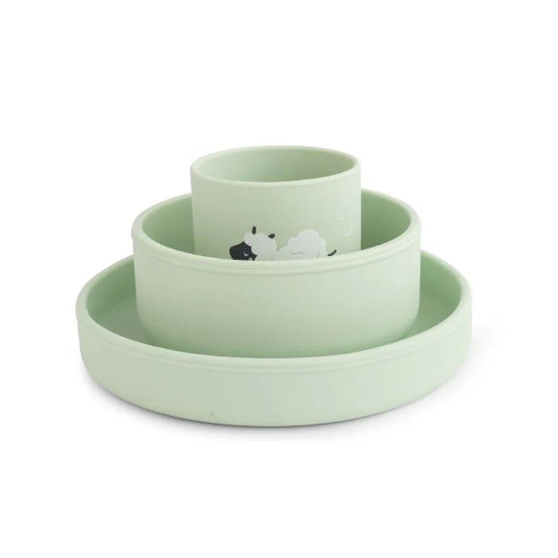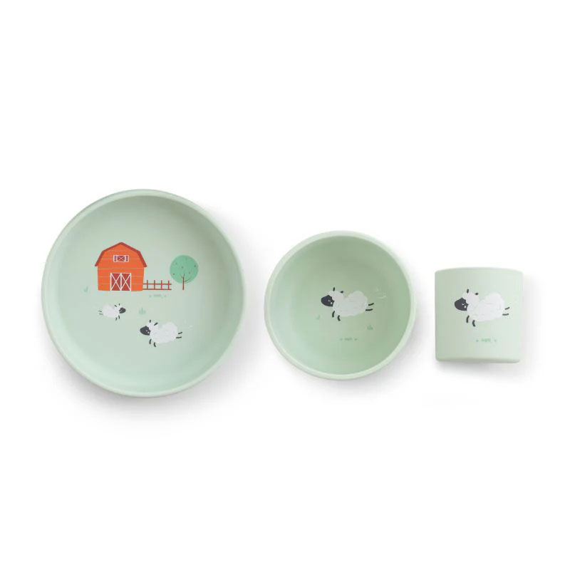 Παιδικό σετ φαγητού από την εταιρεία Saro σε βεραμάν χρώμα και ζωάκια στο σχέδιο. Είναι κατασκευασμένα από σιλικόνη υψηλής ποιότητας κατάλληλη για τρόφιμα, φιλικό προς τα παιδιά και το περιβάλλον. Σύμφωνο με τα ευρωπαϊκά πρότυπα ασφαλείας UNE-EN 14372 & EU10/2011.Το σετ περιλαμβάνει 1 πιάτο με βεντούζα για επιπλέον σταθερότητα, 1 μπωλ και 1 ποτήρι. Ιδανικό σετ για την εισαγωγή του μικρού σας στο Baby Led Weaning. Πλένεται στο πλυντήριο πιάτων και είναι κατάλληλο για φούρνο μικροκυμάτων.