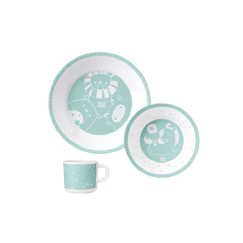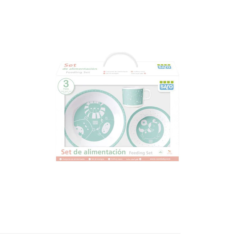 Σετ φαγητού από την εταιρεία Saro αποτελούμενο από 1 πιάτο ρηχό, 1 μπoλ και 1 κούπα με χερούλι. Έχουν λευκό χρώμα με βεραμάν λεπτομέρειες και σχέδιο με ζωάκια. Είναι κατασκευασμένα από 100% μελαμίνη και φυσικά BPA FREE. Είναι κατάλληλα για τον φούρνο μικροκυμάτων εκτός από την κούπα. Κατάλληλο για ηλικίες 6+ μηνών.