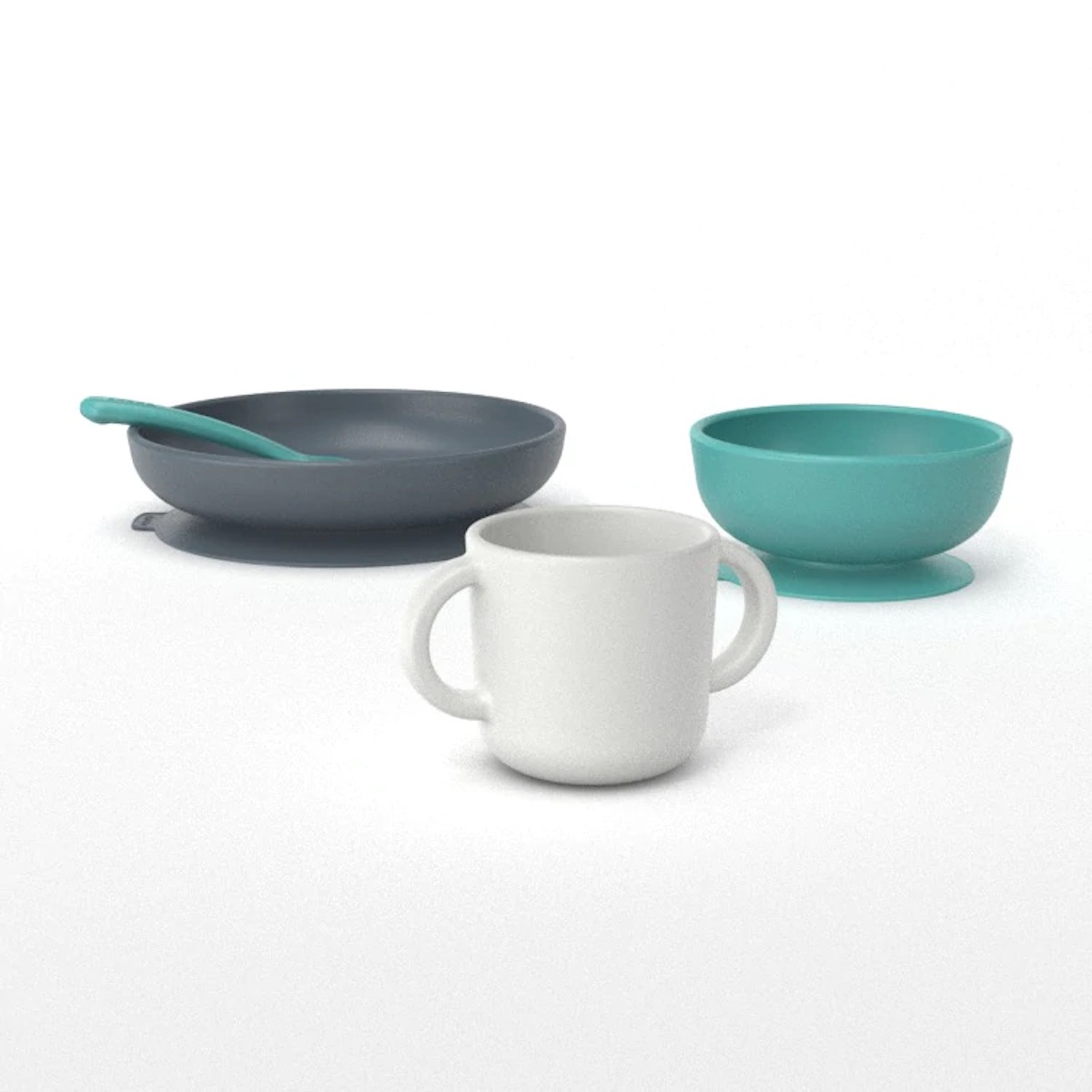 Σετ φαγητού από την σειρά Lagoon της εταιρείας Ekobo με υπέροχους συνδυασμούς χρωμάτων. Τα σκεύη έχουν το σωστό μέγεθος για τα παιδικά χεράκια και αποτελούν ποιοτικά προϊόντα φιλικά προς το περιβάλλον. Αποτελούν μία εξαιρετική εναλλακτική λύση στα παραδοσιακά πλαστικά, τα αναλώσιμα ή εύθραυστα σκεύη. Είναι κατασκευασμένα από υψηλής ποιότητας σιλικόνη 100% κατάλληλη για τρόφιμα. Το μπωλ και το πιάτο διαθέτουν βεντούζα στο κάτω μέρος ώστε να μένουν σταθερά και να αποτρέπουν τυχόν αναποδογυρίσματα και πτώσεις. Το εκπαιδευτικό ποτηράκι έχει βολικές λαβές, κατάλληλες για τα μικρά χεράκια του παιδιού ενώ προστατεύει τα δοντάκια του και συμβάλλει στην μετάβαση από το μπιμπερό. Το κουταλάκι έχει στρογγυλεμένη μύτη ώστε να είναι ασφαλές και να μην τραυματίζει. Πρόκειται για 100% μη τοξικά προϊόντα χωρίς BPA, PVC και φθαλικά στοιχεία. Είναι επαναχρησιμοποιήσιμα, στοιβαζόμενα και κατάλληλα για ζεστά και κρύα φαγητά. Πλένονται στο πλυντήριο πιάτων και μπαίνουν στο φούρνο μικροκυμάτων. Προσοχή: Αν και τα προϊόντα είναι ιδιαίτερα ανθεκτικά, τα Ekobo δεν είναι άθραυστα και μπορούν να αποκτήσουν ρωγμές αν πέσουν κάτω ή αν χτυπηθούν πάνω σε σκληρές επιφάνειες. Η χρήση από παιδιά κάτω των 3 ετών, συνίσταται μόνο με την επιτήρηση ενήλικα. Συσκευασία κουτί.
