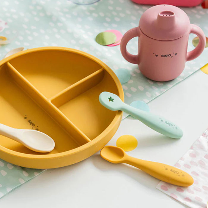Σετ φαγητού σε μουσταρδί-μπεζ χρώμα από την εταιρία Saro. Είναι κατασκευασμένα από σιλικόνη premium ποιότητας κατάλληλη για τρόφιμα. Ένα υλικό φιλικό προς το περιβάλλον, αντιβακτηριδιακό, εξαιρετικά ανθεκτικό, δεν παραμορφώνεται και είναι πολύ εύκαμπτο. Αντέχει σε ακραίες θερμοκρασίες χωρίς να χάνει τις ιδιότητές του. Το πιάτο διαθέτει βεντούζα στο κάτω μέρος για να στερεώνεται σωστά στο τραπέζι χωρίς να ανησυχείτε για τυχόν ζημιές. Το ποτήρι έχει λαβές ειδικά σχεδιασμένες για μικρά χεράκια και το στόμιο βοηθάει στο να μπορούν να πιούν και να ρουφήξουν ταυτόχρονα. Επίσης, έχει και ένα κουταλάκι και ένα πιρουνάκι. Ιδανικό σετ για Baby Led Weaning καθώς ο σχεδιασμός του είναι ιδανικός για να μάθει το μικρό σας να τρώει μόνο του. Προάγει την ανεξαρτησία και την αυτοεκτίμηση του μικρού που θα μάθει να τρώει μόνο του.