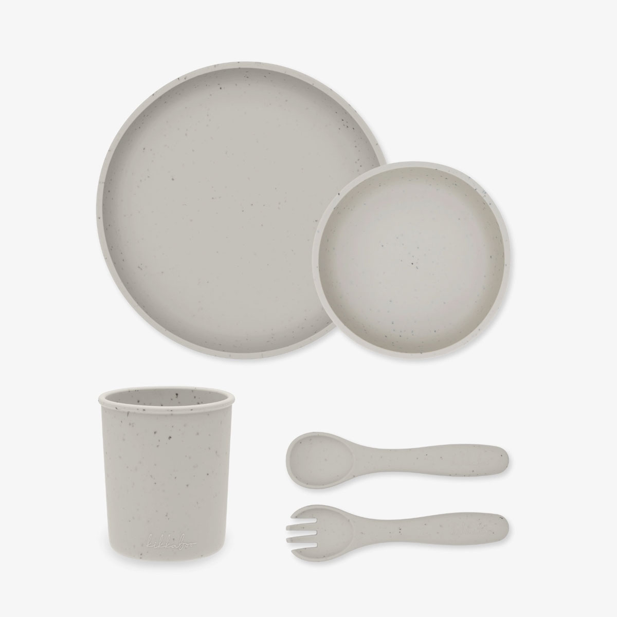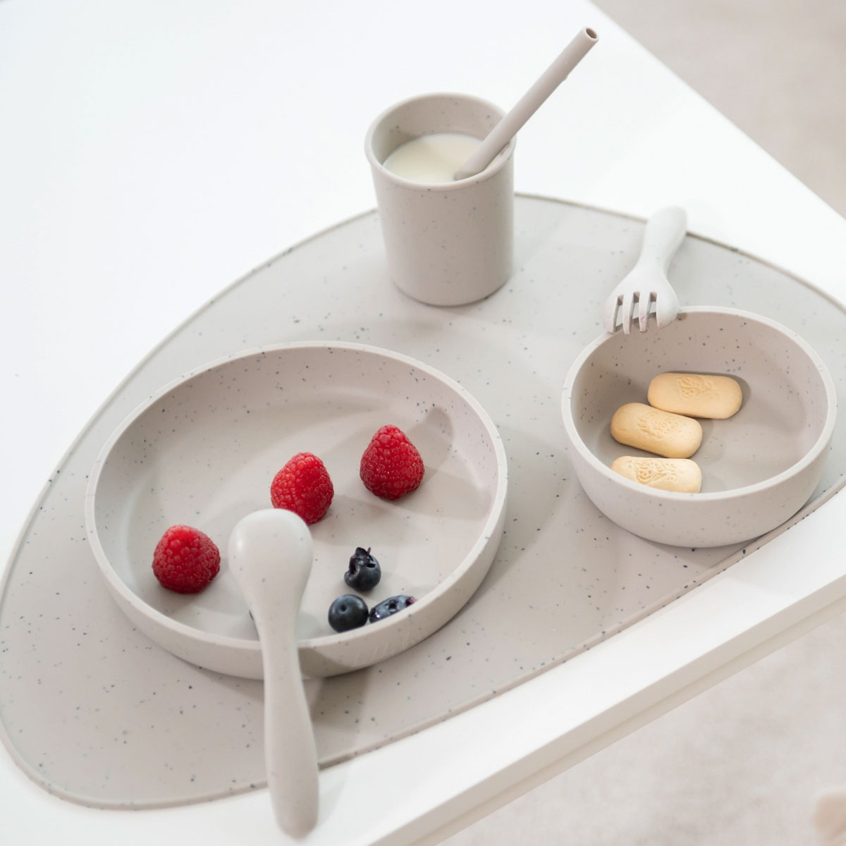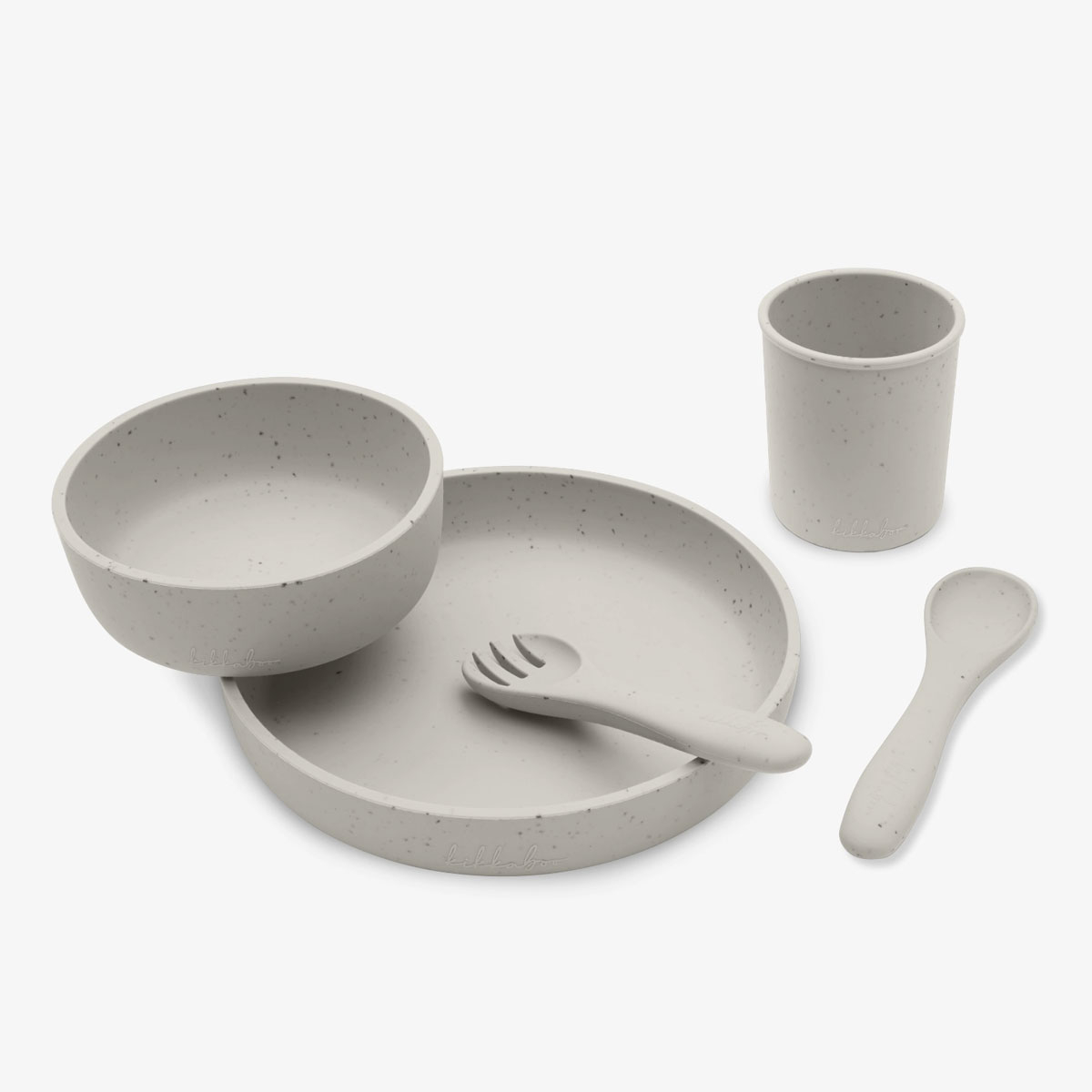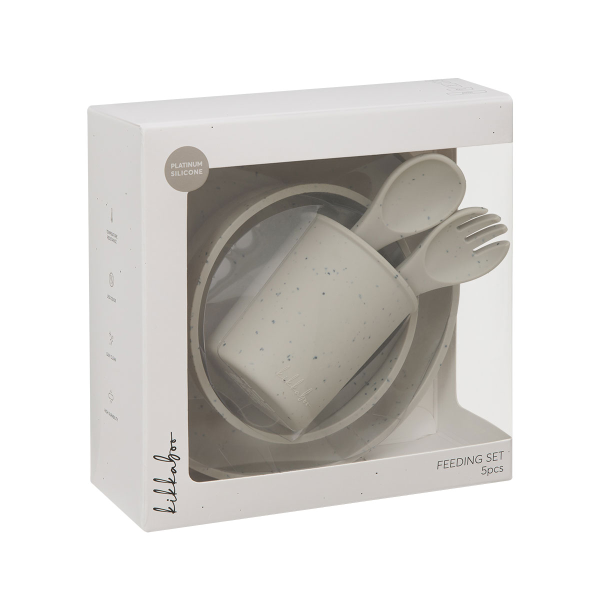 Παιδικό σετ φαγητού από την εταιρεία Kikka Boo σε γκρι-μπεζ χρώμα. Είναι κατασκευασμένο από πλατινένια σιλικόνη απαλλαγμένη από BPA. Η ποιότητά του, του επιτρέπει να αντέχει σε θερμοκρασίες από -40°C έως 230°C. Επίσης, είναι μαλακό, εύκαμπτο και άοσμο υλικό. Ιδανικό σετ για τα πρώτα γεύματα του μωρού κατά την περίοδο απογαλακτισμού. Ενθαρρύνει την αυτοσίτιση. Το σετ περιλαμβάνει πιάτο, μπολ, κουτάλι, πιρούνι και ένα ποτηράκι. Κατάλληλο για ηλικίες 6 μηνών και άνω.