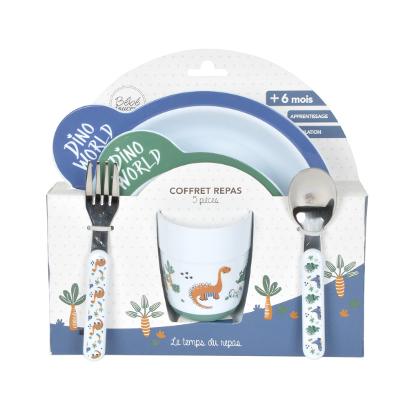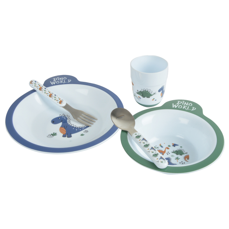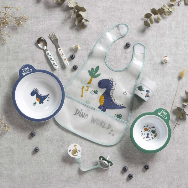 Παιδικό σετ φαγητού σε λευκό χρώμα με βεραμάν και μπλε λεπτομέρειες και σχέδιο δεινοσαυράκι. Είναι κατασκευασμένο από μη τοξικό πλαστικό χωρίς BPA. Το σετ περιλαμβάνει πιάτο, μπολ, κουτάλι, πιρούνι και ένα ποτηράκι. Ιδανικό σετ που θα βοηθήσει το μικρό σας να νιώσει ανεξάρτητο. Κατάλληλο για ηλικίες 6 μηνών και άνω. Συνδυάστε το με τα υπόλοιπα είδη της ίδιας συλλογής για ένα ολοκληρωμένο αποτέλεσμα.