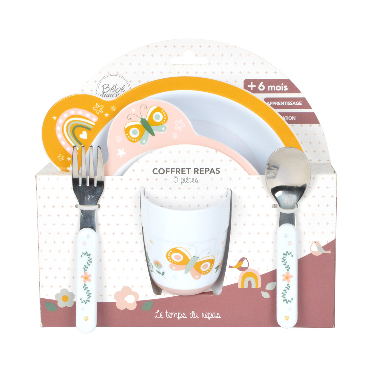 Παιδικό σετ φαγητού σε λευκό χρώμα με μουσταρδί και ροζ λεπτομέρειες και σχέδιο πεταλουδίτσα. Είναι κατασκευασμένο από μη τοξικό πλαστικό χωρίς BPA. Το σετ περιλαμβάνει πιάτο, μπολ, κουτάλι, πιρούνι και ένα ποτηράκι. Ιδανικό σετ που θα βοηθήσει το μικρό σας να νιώσει ανεξάρτητο. Κατάλληλο για ηλικίες 6 μηνών και άνω. Συνδυάστε το με τα υπόλοιπα είδη της ίδιας συλλογής για ένα ολοκληρωμένο αποτέλεσμα.