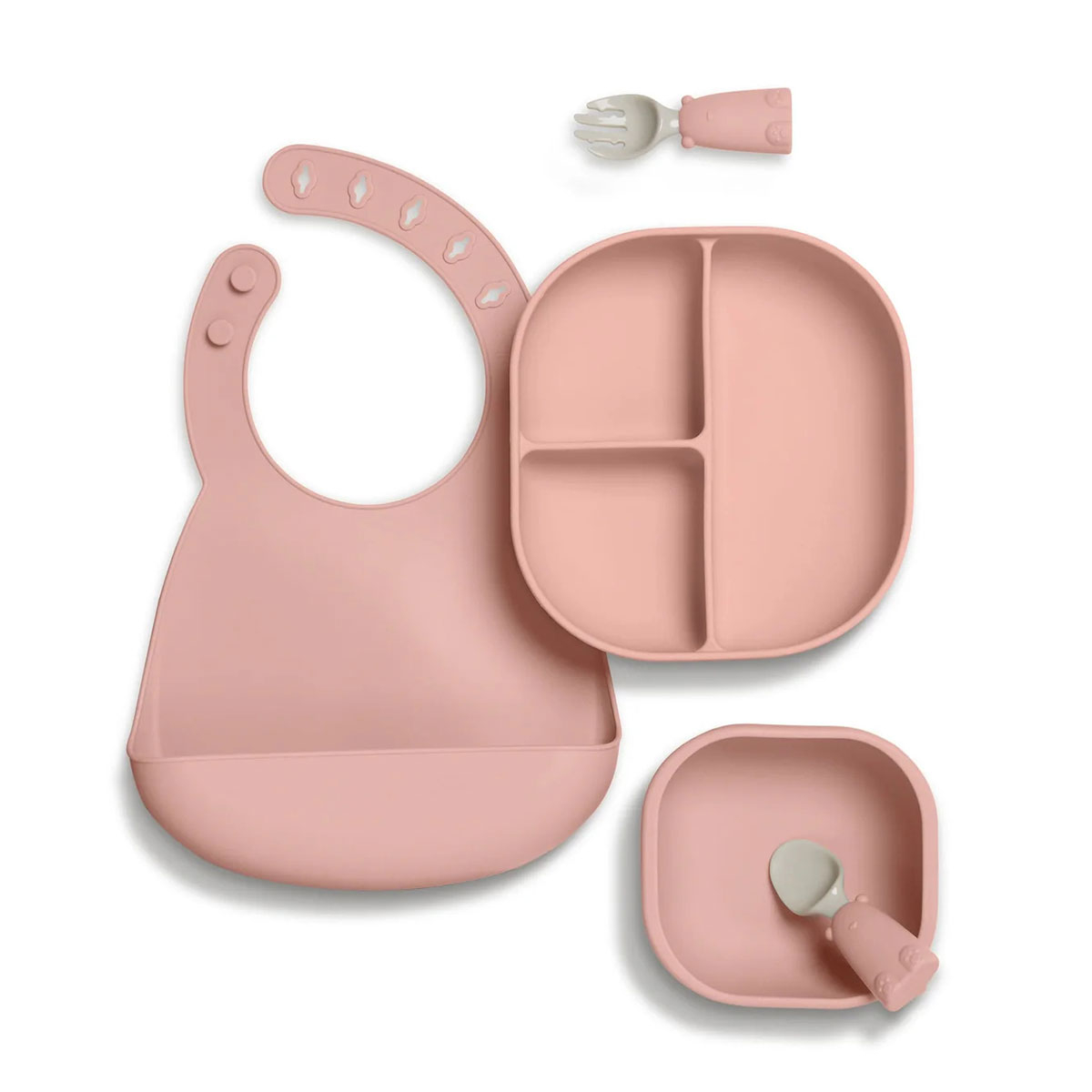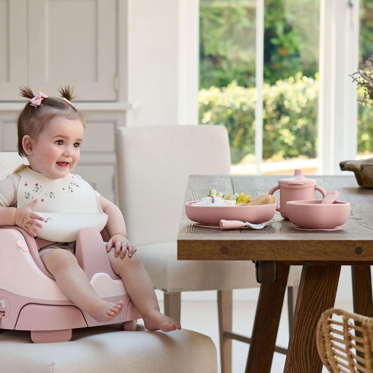 Παιδικό σετ φαγητού από την εταιρεία Mamas & Papas σε ροζ χρώμα. Είναι κατασκευασμένα από υψηλής ποιότητας σιλικόνη με πιστοποίηση EN14372:2004. Είναι κατάλληλο για το στάδιο του απογαλακτισμού. Αποτελείται από ένα πιάτο με χωρίσματα που διευκολύνει το παιδί να μάθει τις διαφορετικές γεύσεις και υφές. Το ψηλό χείλος του το βοηθάει να έχει πιο σταθερή βάση όταν προσπαθεί να "συλλέξει" το φαγητό με το πιρούνι ή το κουτάλι, χωρίς να γλιστράει εύκολα έξω από το πιάτο. Έτσι ενισχύει την αυτονομία του. Διαθέτει βεντούζα από κάτω για μεγαλύτερη ασφάλεια. Το μπολάκι έχει και αυτό βεντούζα στο κάτω μέρος. Το κουτάλι και το πιρούνι είναι χοντρά με κοντό άκρο και βοηθούν στην ανάπτυξη της ικανότητας του παιδιού να τα κρατάει σωστά και να τα χρησιμοποιεί για να φέρει το φαγητό στο στόμα του. Τέλος, η σαλιάρα τοποθετείται και αφαιρείται εύκολα με μαλακά κουμπιά. Έχει 5 διαφορετικές θέσεις κουμπώματος, ώστε να προσαρμόζεται σωστά στο λαιμουδάκι του μωρού σας. Η μπροστινή τσέπη είναι ιδανική για την περισυλλογή ψίχουλων και τροφίμων, για την διασφάλιση μιας καθαρότερης ώρας φαγητού. Ιδανικό σετ για κάθε παιδί.
