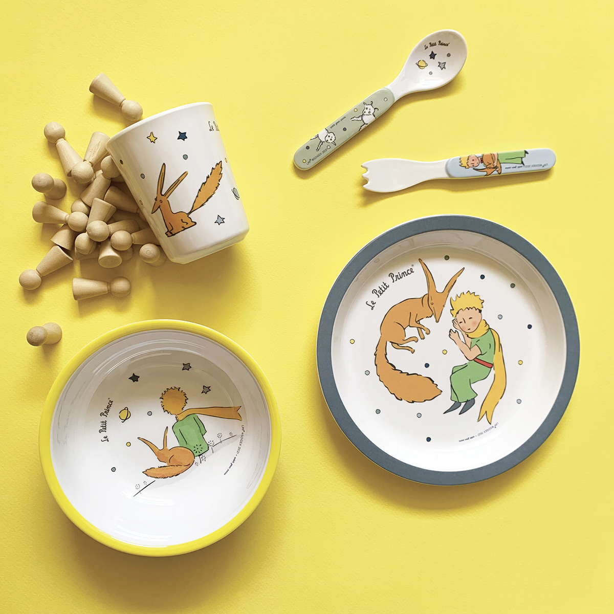 Παιδικό σετ φαγητού σε λευκό χρώμα, με μπλε-κίτρινες λεπτομέρειες και σχέδιο Μικρός Πρίγκιπας από την εταιρεία Petit Jour Paris. Είναι κατασκευασμένο από 100% μελαμίνη χωρίς BPA. Το σετ περιλαμβάνει πιάτο, μπολ, κουτάλι, πιρούνι και ένα ποτηράκι. Ιδανικό σετ που θα βοηθήσει το μικρό σας να νιώσει ανεξάρτητο. Κατάλληλο για ηλικίες 6 μηνών και άνω. Συνδυάστε το με τα υπόλοιπα είδη του ίδιου σχεδίου για ένα ολοκληρωμένο αποτέλεσμα.