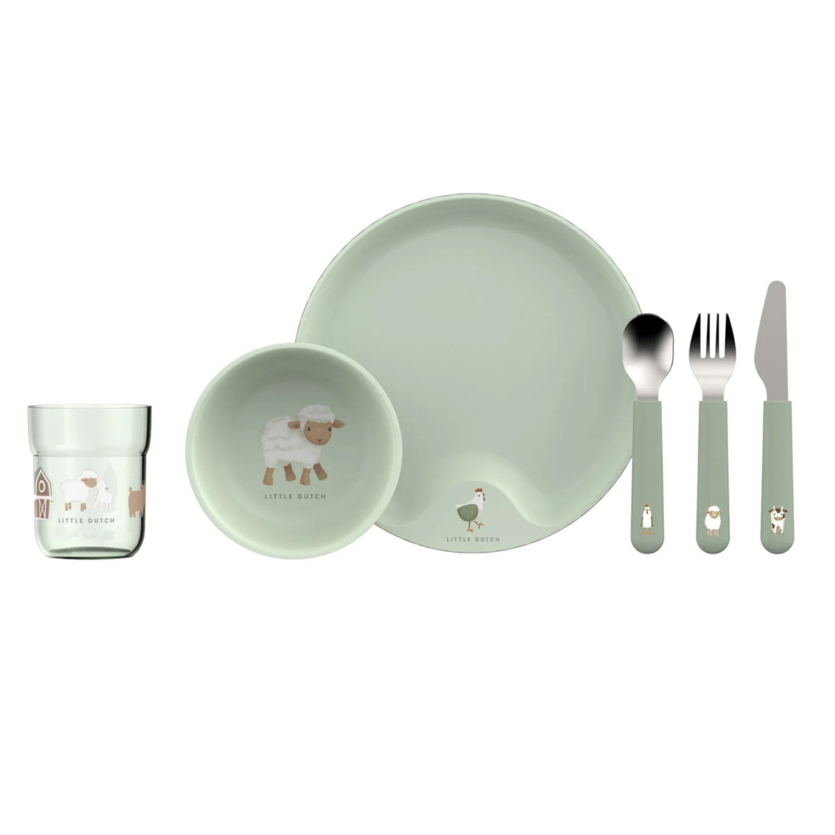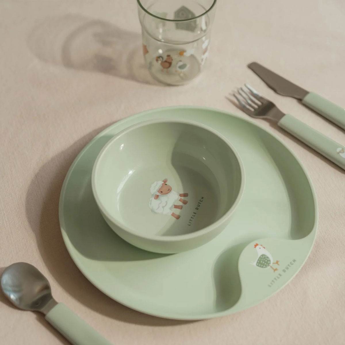 Σετ φαγητού από την εταιρεία Little Dutch σε πράσινο χρώμα με ζωάκια στο σχέδιο. Είναι κατασκευασμένα από πλαστικό υλικό χωρίς BPA. Το σετ διαθέτει 1 πιάτο, 1 μπωλ και 1 ποτήρι. Επίσης, διαθέτει σετ μαχαιροπήρουνα που αποτελείται από 1 μαχαίρι, 1 κουτάλι και 1 πιρούνι. Τα μαχαιροπίρουνα είναι ειδικά σχεδιασμένα με εργονομικές λαβές σε παιδικό μέγεθος για σταθερό κράτημα. Έχουν στρογγυλεμένες άκρες, και το μαχαίρι έχει ασφαλή λεπίδα. Ιδανικό σετ φαγητού.