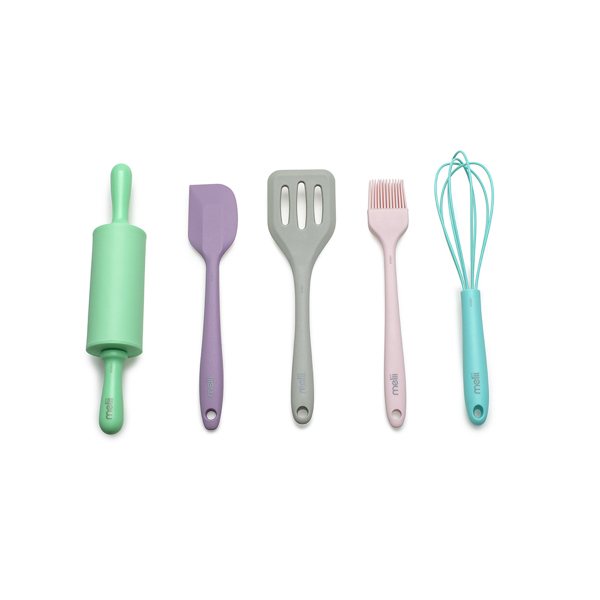 Παιδικό σετ 5 τεμαχίων με διάφορα εργαλεία ζαχαροπλαστικής σε διάφορες αποχρώσεις από την εταιρία Melii. Είναι κατασκευασμένα από μαλακή και υψηλής ποιότητας σιλικόνη με ανθεκτικό πυρήνα από ανοξείδωτο χάλυβα. Αποτελεί το ιδανικό σετ για συμμετέχει το μικρό σας στις διάφορες κατασκευές ζαχαροπλαστικής, περνώντας ποιοτικό χρόνο με τους γονείς. Έχουν ιδανικό μέγεθος για μικρά χεράκια ενώ μπορούν να χρησιμοποιηθούν αναμφίβολα και σαν σετ παιχνιδιού. Χωρίς BPA, PVC, μόλυβδο και κάδμιο. O αναδευτήρας, η σπάτουλα και το πινέλο είναι ανθεκτικά στη θερμότητα έως και 446F ή 230C.