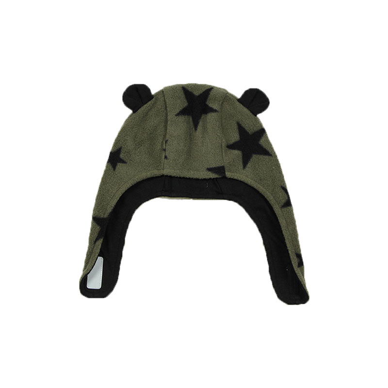 Παιδικό σκουφάκι σε χακί χρώμα, με μαύρες λεπτομέρειες και σχέδιο αστέρια από την εταιρεία Minene. Είναι κατασκευασμένο από 100% απαλό βαμβάκι ενώ η εξωτερική πλευρά του είναι από απαλό fleece ύφασμα. Κλείνει στο κάτω μέρος με velcro. Ιδανικό για να κρατάει το κεφαλάκι και τα αυτάκια του μικρού σας ζεστά τις κρύες ημέρες του χειμώνα. Κατάλληλο για ηλικίες 12-18 μηνών.